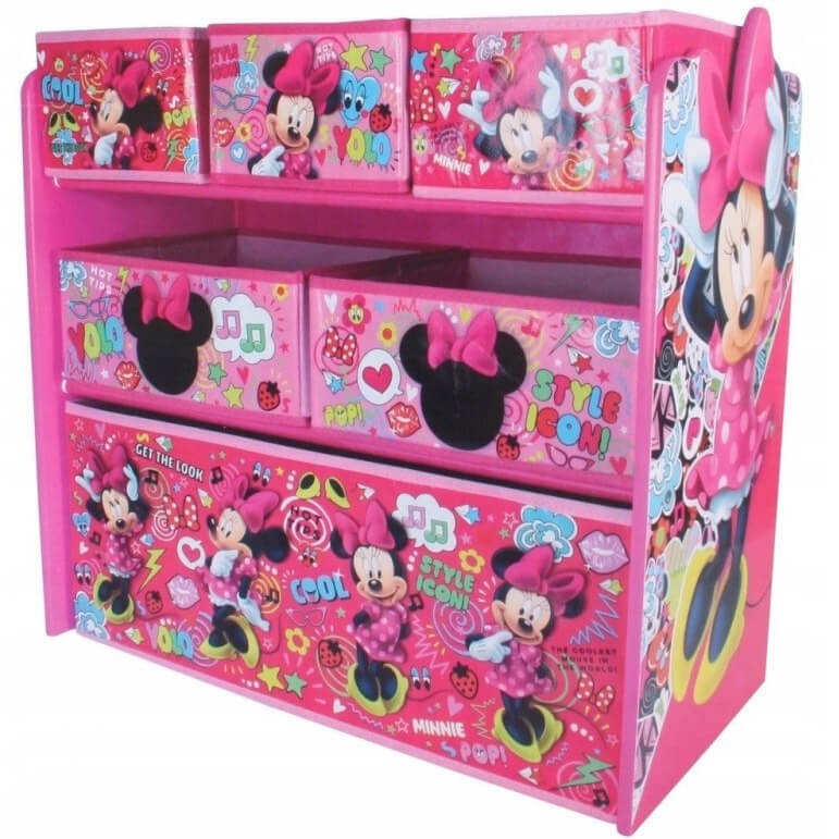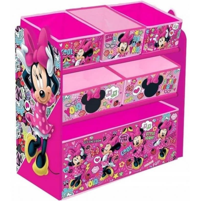 Gyönyörű színes játéktároló 6 különböző méretű, vászonból készült dobozzal, melyet a népszerű Disney figura, mosolygó Minnie egér arca díszíti. Minden kislánynak garantáltan örömet okoz. A játékok unalmas rendrakása szórakoztató is lehet. A játéktároló ideális játékok tárolására, 6 db vászondobozt tartalmaz, amelyeket úgy terveztek, hogy a gyerekek egyedül is el tudják rakni a játékaikat.