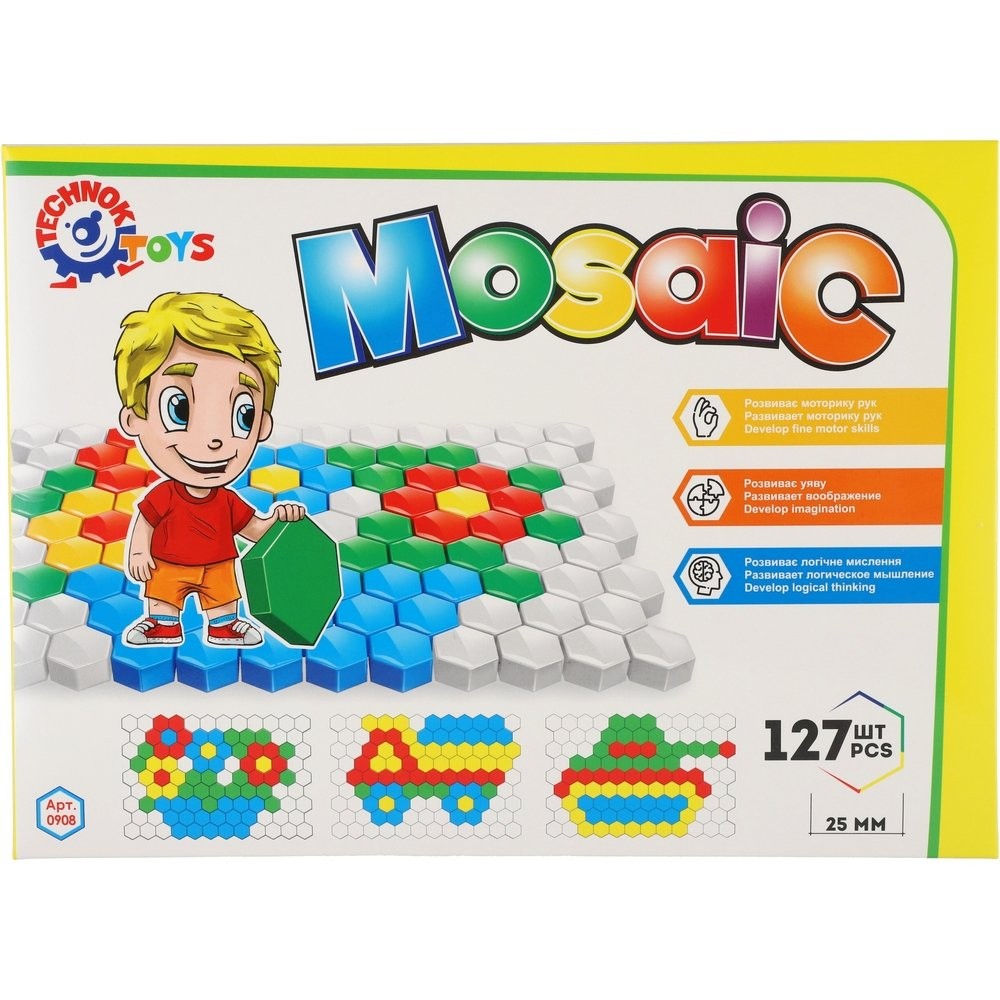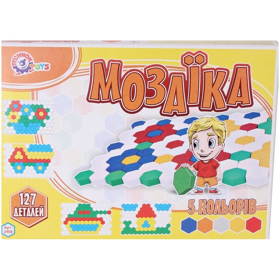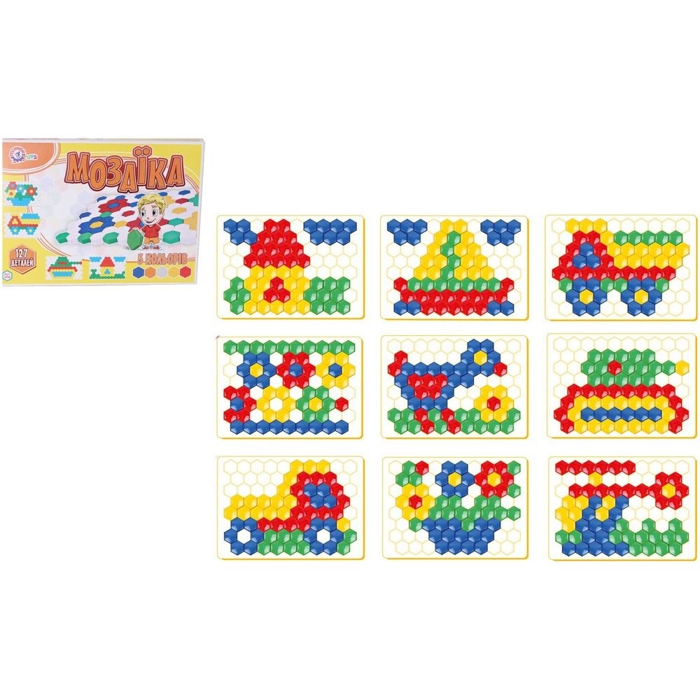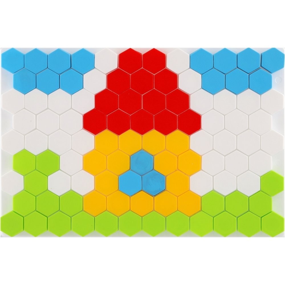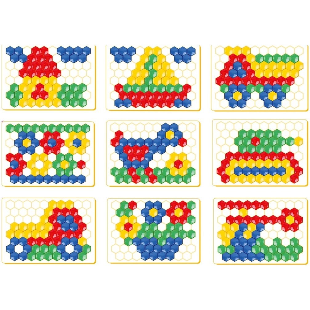 A készlet alapja egy szőnyeg, amely méhkasokra emlékeztet. A készlet különböző színű részeit erre a szőnyegre helyezik, és a gyerekek különböző képeket készíthetnek fantáziájuk vagy a dobozon látható képek alapján. A készlet 127 db-ot tartalmaz. A darab mérete: 2,5 cm Doboz mérete: 34 x 24 x 4 cm 3 éves kortól alkalmas