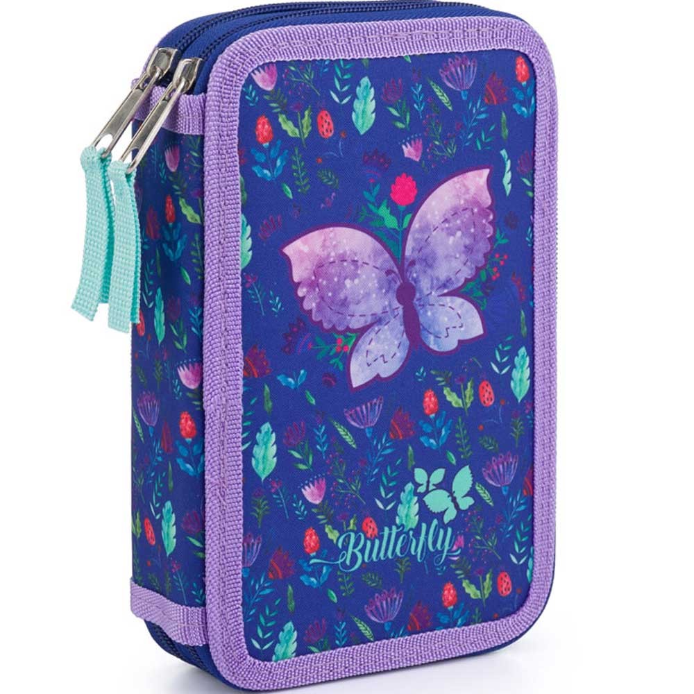 Kétszintes iskolai tolltartó, felszerelés nélkül, pillangó mintával. A tolltartó 25 db gumihurkot tartalmaz az összes íróeszköz és a tanításhoz szükséges apróság tárolására. A tolltartó tömör cipzárral rendelkezik, nagy kihúzásokkal a könnyű kezelés érdekében. Az egyik emeleten egy átlátszó rekesz található a heti ütemezéshez. Méretek: 13,5 × 21 × 4,5 cm