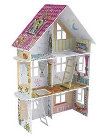 Ezt a házikót a gyerekek a saját elképzeléseiknek megfelelően kifesthetik és játszhatnak benne apró játékaikkal. A házikó kemény és tartós kartonból készült. A könnyű és tartós szerkezet könnyen összeszerelhető, zsírkrétával, filctollal vagy festékkel festhető. 5 éves kortól Méret: 50 x 68 x 21,5 cm Gyártó: Ditipo