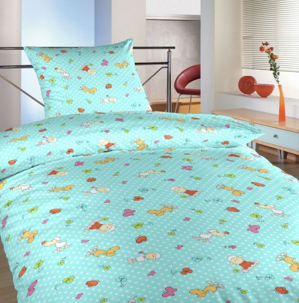 Türkiz színű pamut ágynemű kis birka motívummal. A betétek cipzárasak és szabványos méretek: 140x200, 70x90 cm.