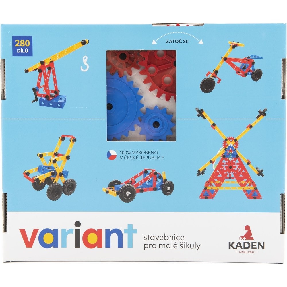 A klasszikus csavar és anya végig kíséri a gyerekeket. A készletek teret engednek a gyermekeknek a szabad játékhoz, lehetővé teszik számukra, hogy sok változó egységet összeszereljenek, és ezáltal fejlesszék a motorikus készségeket, valamint a térbeli fantáziát, fantáziát és türelmet. Többször és sok éven át használhatók. Kisebb gyermekeknél segítenek a színek, formák és a már említett finom motorikus képességek érzékelésének fejlesztésében, idősebb gyermekeknél az alapvető matematikai vagy fizikai jelenségek megértésében. A doboz 280 darab teljes készletet tartalmaz, beleértve 2 fogaskereket 50 láncú lánccal.