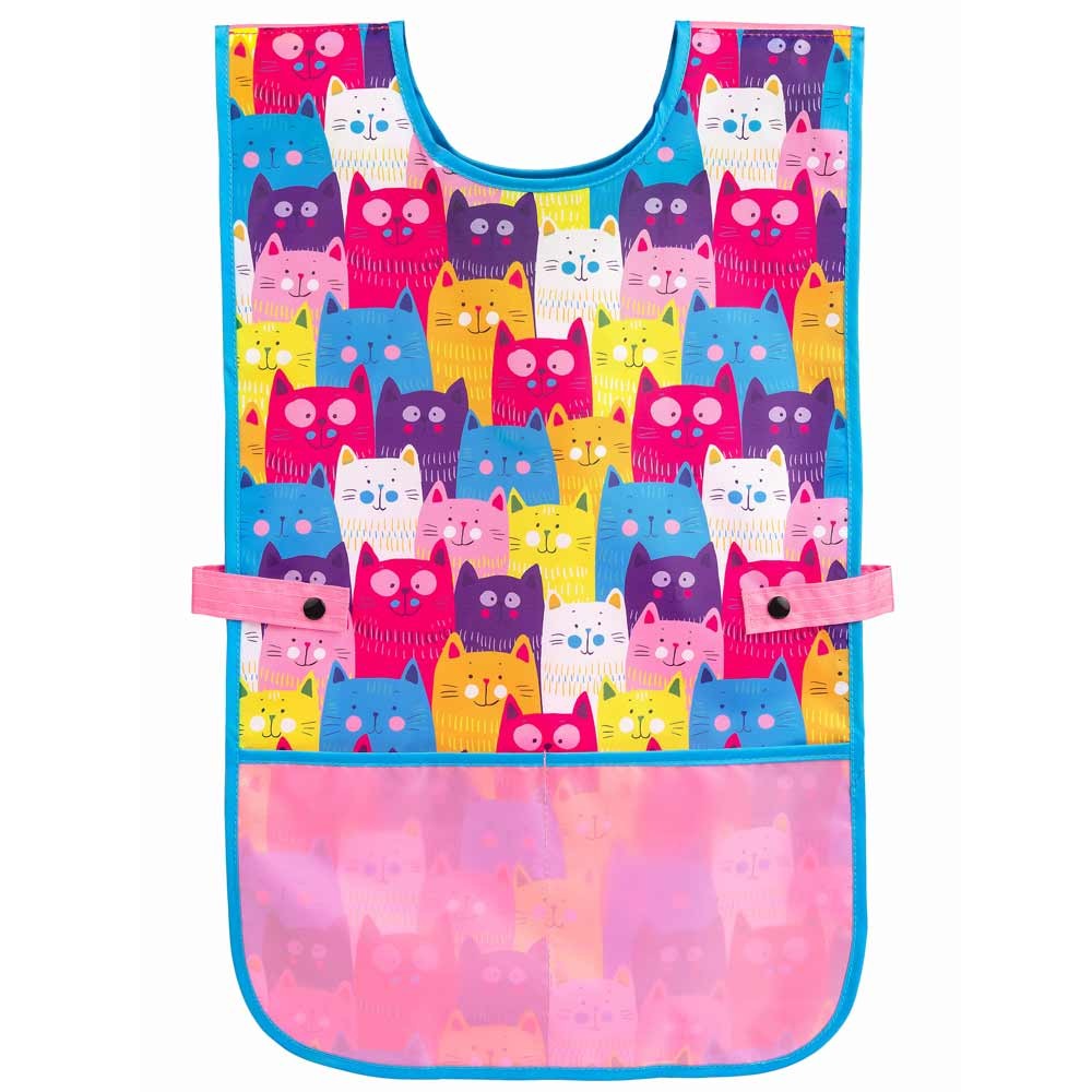 A poncsó típusú művészetoktató kötény praktikus nyomatokkal rögzíthető. A gyereknek nem kell a hátára kötnie a kötényt, könnyedén beállíthatja a méretet a dereka körül és egyben a praktikus szabásnak köszönhetően nagyobb testrésze védett. A kötény két zsebbel rendelkezik, és könnyen mosható.