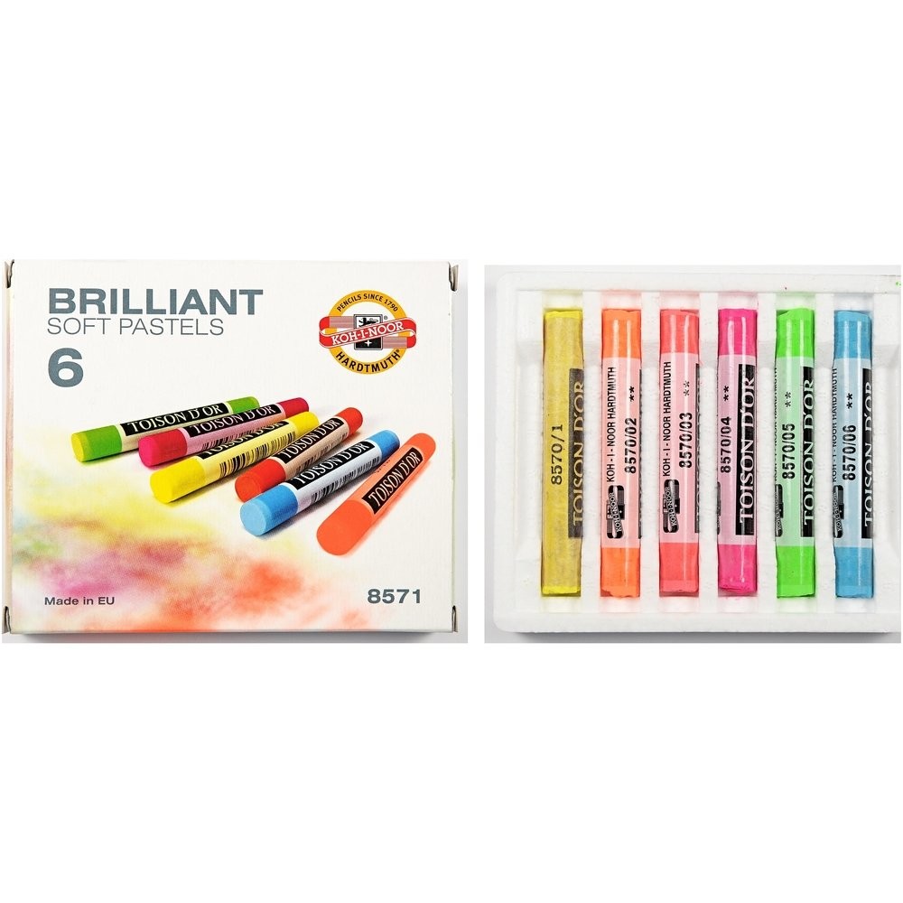 Kerek porkréta, 9 mm átmérőjű papírborítással. Kizárólag papírra alkalmas, szárazon könnyen szétkenhetőek, amivel finom átmeneteket hozhat létre. Száraz pasztell porkréták 6 színben. Gyártó: Koh-i-noor