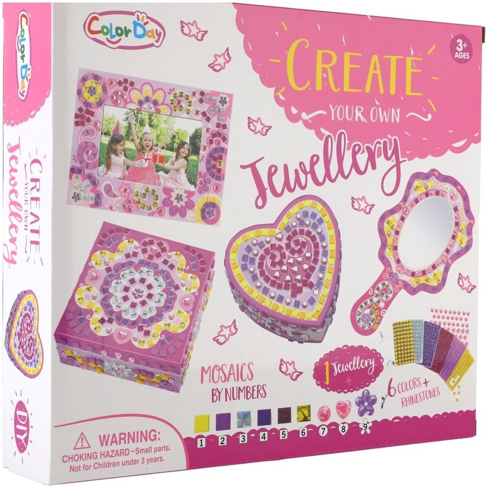 Kreatív ékszerdoboz, amit a mellékelt csillogó darabok segítségével mozaikkal díszíthetsz. Az egyes darabokat az illusztrált számokkal ellátott dobozokra ragasztjuk. A csomag tartalma: ékszerdoboz, 300 db habmatrica, 58 db csillogó kő. Doboz mérete: 29 x 25,5 x 6 cm 3 éves kortól alkalmas