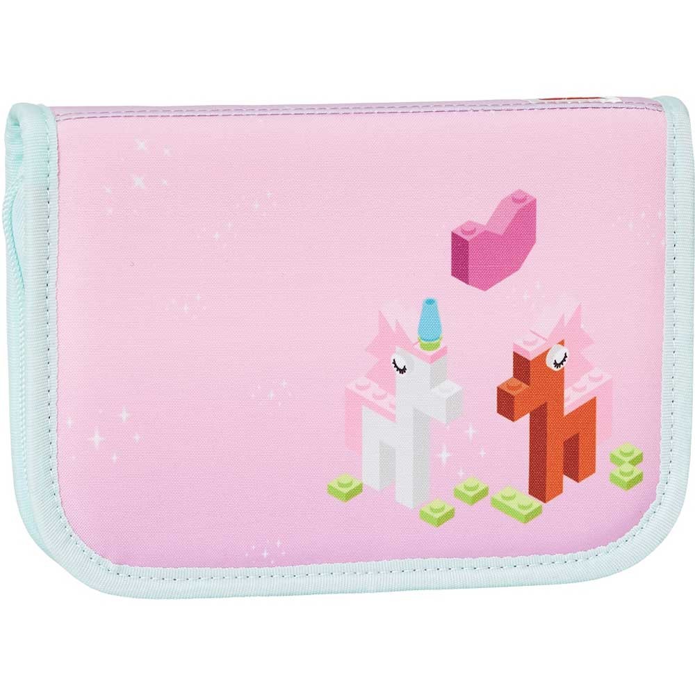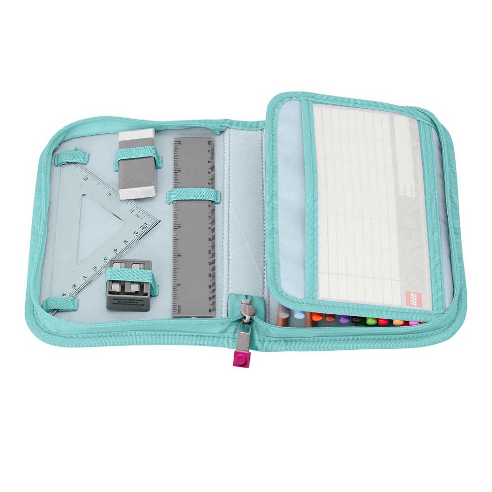 Feltöltött LEGO tolltartó lányoknak az iskolához szükséges összes írószert tartalmazza. A tok a következőket tartalmazza: 2 grafit ceruza, 10 színes zsírkréta, 4 széles színes zsírkréta, radír, hegyező, egyenes és háromszög vonalzó. A tokban átlátszó zsebben az órarend és egy bevarrt névtábla található. Tartós anyagból készült, PVC használata nélkül. Számos népszerű LEGO témában elérhető. Ideális az általános iskola első évében.
