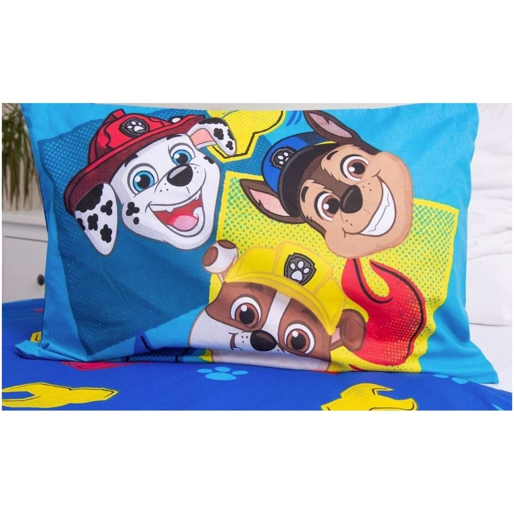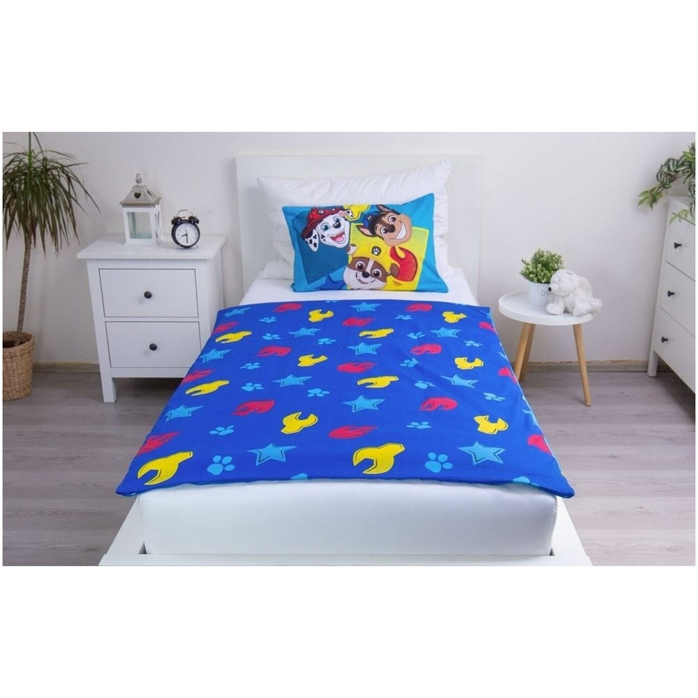 Vidám ágyneműhuzat kedvenc Mancs őrjárat hőseivel - Marshall-lal, Chase-szel és Rubble-lel - kék alapon, a "Pawsome Days Ahead" felirattal feldobja bármelyik gyermek kiságyát.