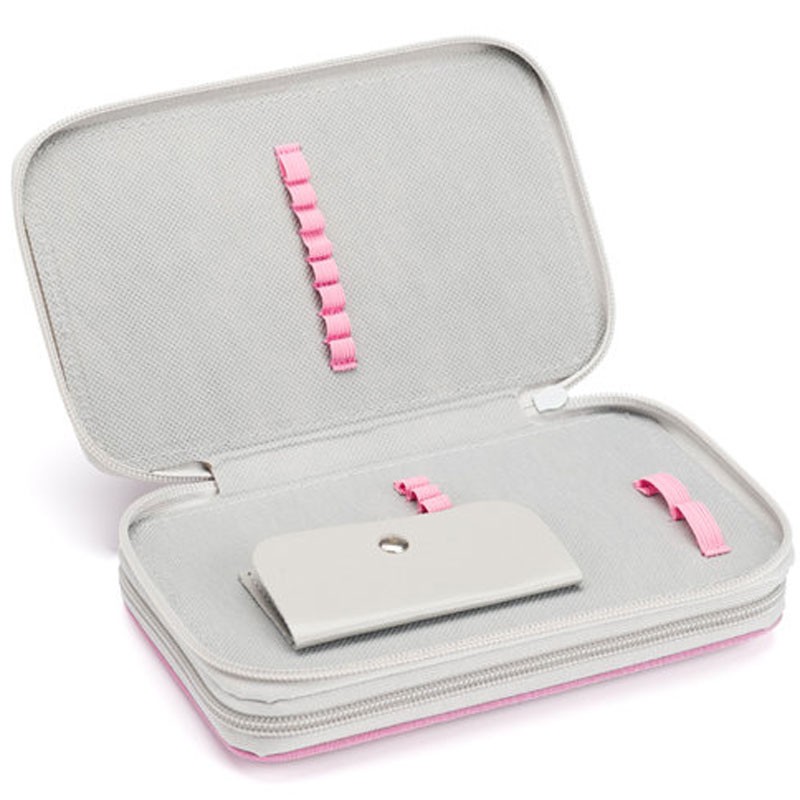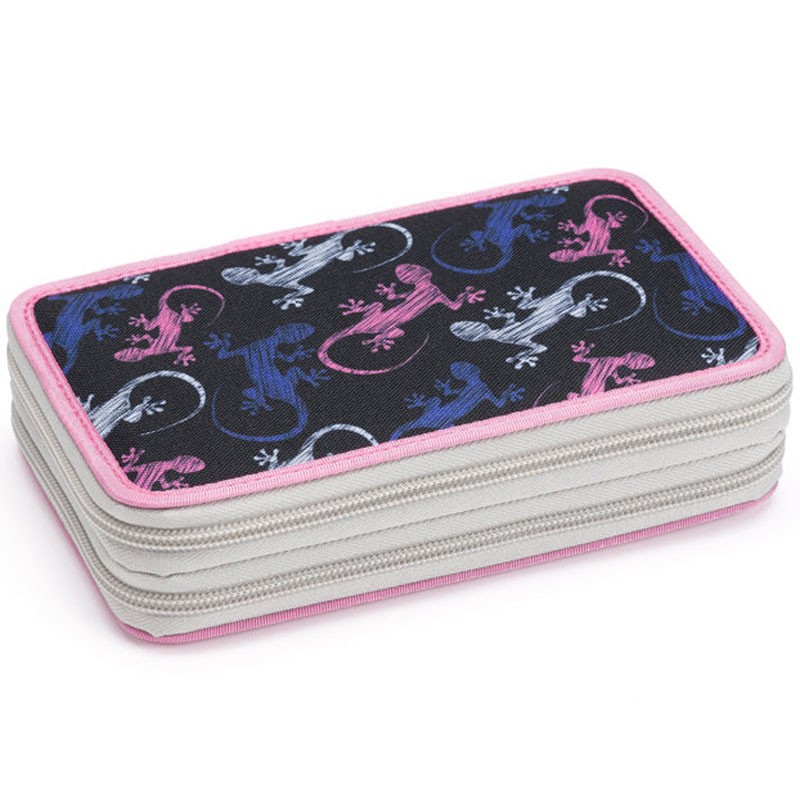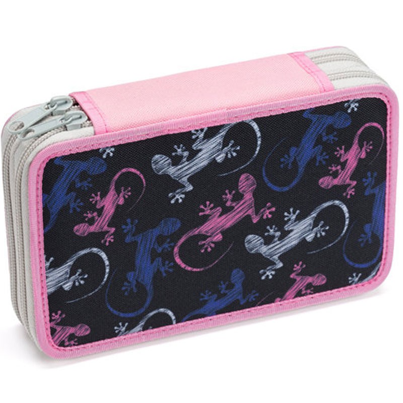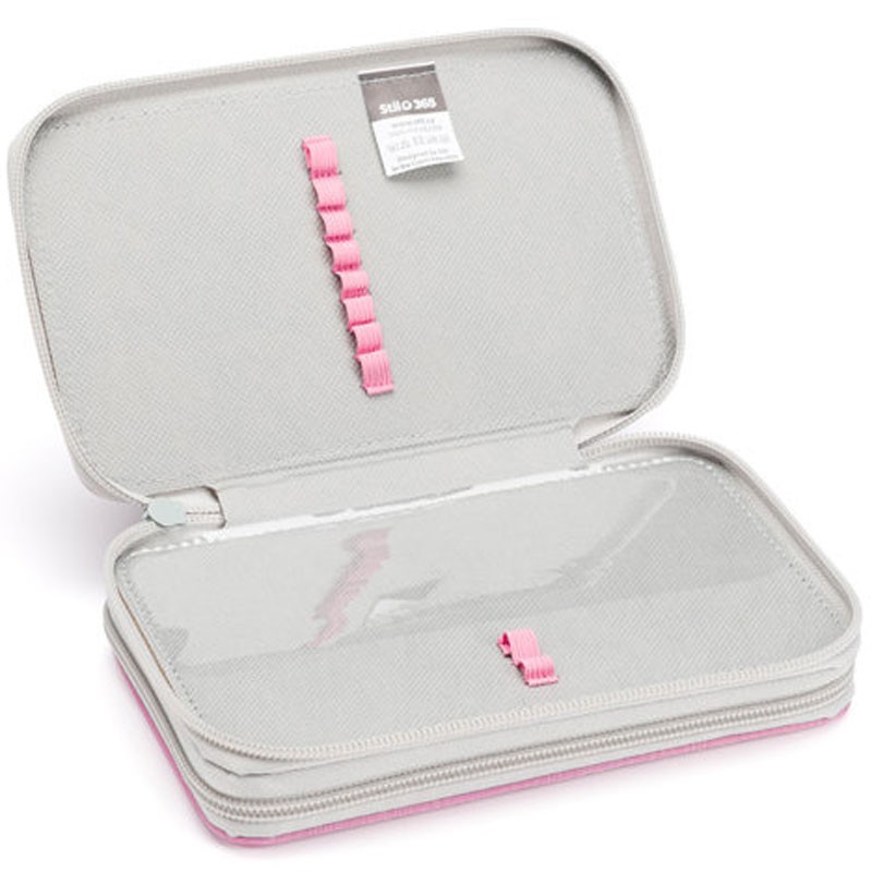 Emeletes tolltartó lányoknak, üres. Az első emeleten 10 gumihurkot tartalmaz zsírkrétához, ceruzához és három gumihurkot radír vagy hegyező tárolására. Egy zseb is található az apró tárgyak számára patentos zárással. A tolltartó második emeletén egy átlátszó zseb található az órarendnek és további 9 erős gumiszalag a különböző méretű íróeszközökhöz.