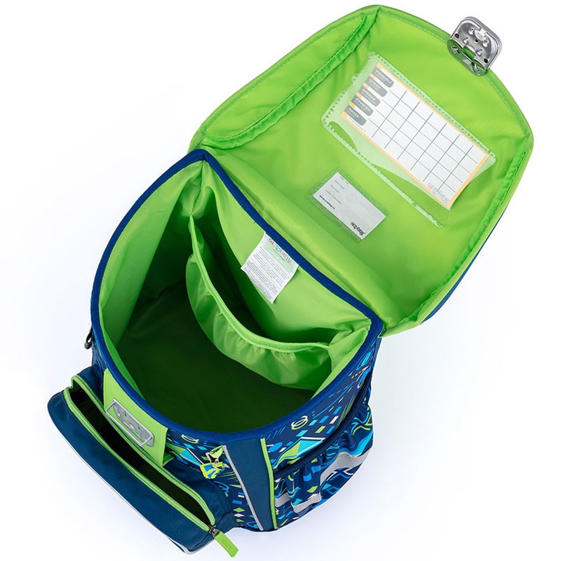 A Premium sorozatú iskolatáska minden oldalán erősítéssel, erős és kemény aljzattal, valamint szilárd füllel rendelkezik. Az ergonomikusan kialakított A Premium sorozatú iskolatáska minden oldalán erősítéssel, erős és kemény aljzattal, valamint szilárd füllel rendelkezik. Az ergonomikusan kialakított háttámla biztosítja az optimális súlyeloszlást és minimálisra csökkenti a gyermek gerincére nehezedő nyomást, a profilozott szellőzőhornyok pedig a hatékony légáramlást támogatják. A vállpántok kényelmes anyagból készültek. Felső részükön szorító pántok találhatók, amelyek javíthatják a hátulsó tapadást. A sínen állítható magasságú mellkaspánt is tartozik hozzá. Az egyik nagy, jól elrendezett kamrának van egy dupla mozgatható válaszfala (deszkák számára), belül gumival. Elölről hőszigetelt egy külön külső zseb az uzsonnás doboz számára. A két egyforma oldalzseb most gumihálóból készült, így könnyebben elhelyezhető egy palack vagy esernyő. Az oldalzsebeken, az elülső és a vállpántokon fényvisszaverő felületek találhatók a jobb láthatóság és biztonság érdekében.