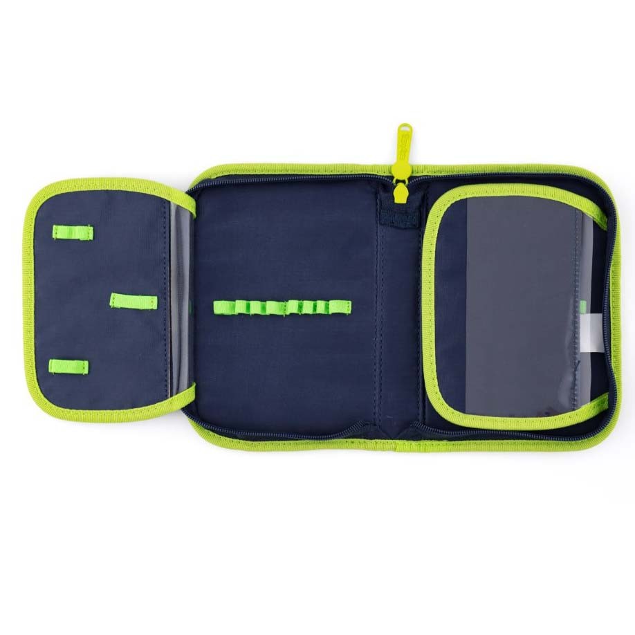 Egyszintes iskolai tolltartó két kihajtató füllel, üres. Gumi hurok írószerek tartásához. A belső szárnyon átlátszó fólia található az órarendhez.