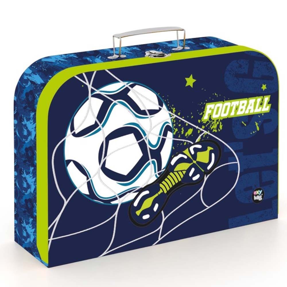 Iskolatáska szett fiúknak normál magasságú első osztályosok számára megfelelő. Az öt részes focis iskolatáska szett tartalma: iskolatáska, üres tolltartó, tornazsák, A4-es füzettartó és bőrönd.