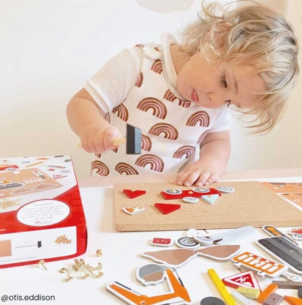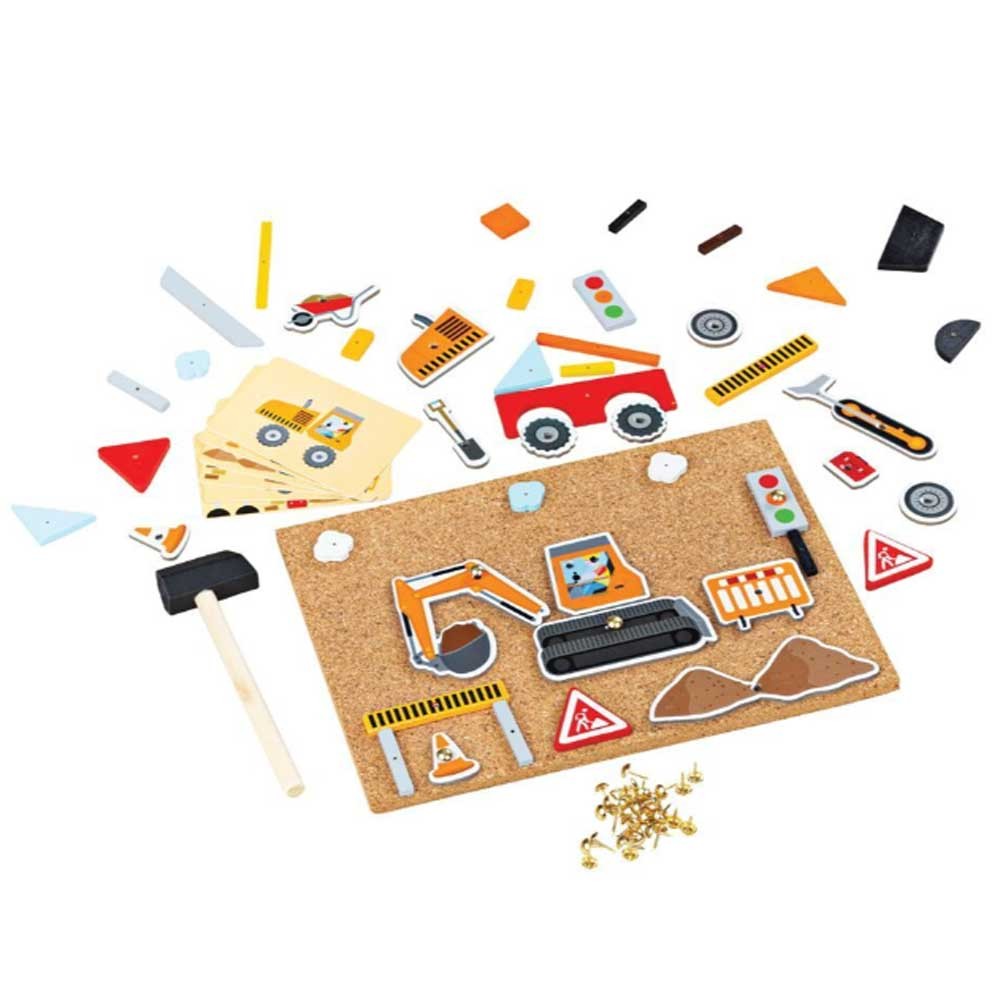 Fa formák, kalapács, szögek és parafatábla – ez egy művészeti klasszikus, amely nemcsak szórakoztatja a gyerekeket, hanem fejleszti is őket! A kis építők elkészíthetik saját képeiket, vagy a mellékelt sablonok segítségével össze is állíthatják azokat.