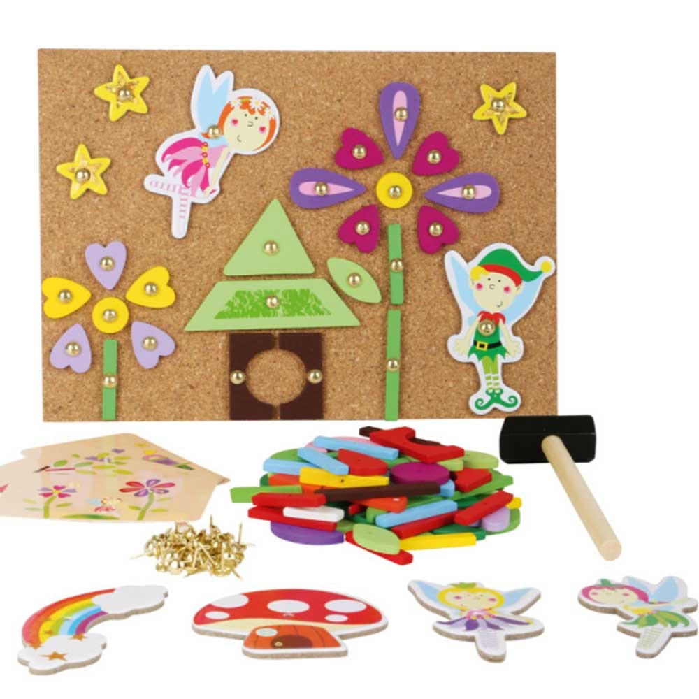 Fa formák, kalapács, szögek és parafatábla – ez egy művészeti klasszikus, amely nemcsak szórakoztatja a gyerekeket, hanem fejleszti is őket! A kis építők elkészíthetik saját képeiket, vagy a mellékelt sablonok segítségével össze is állíthatják azokat.
