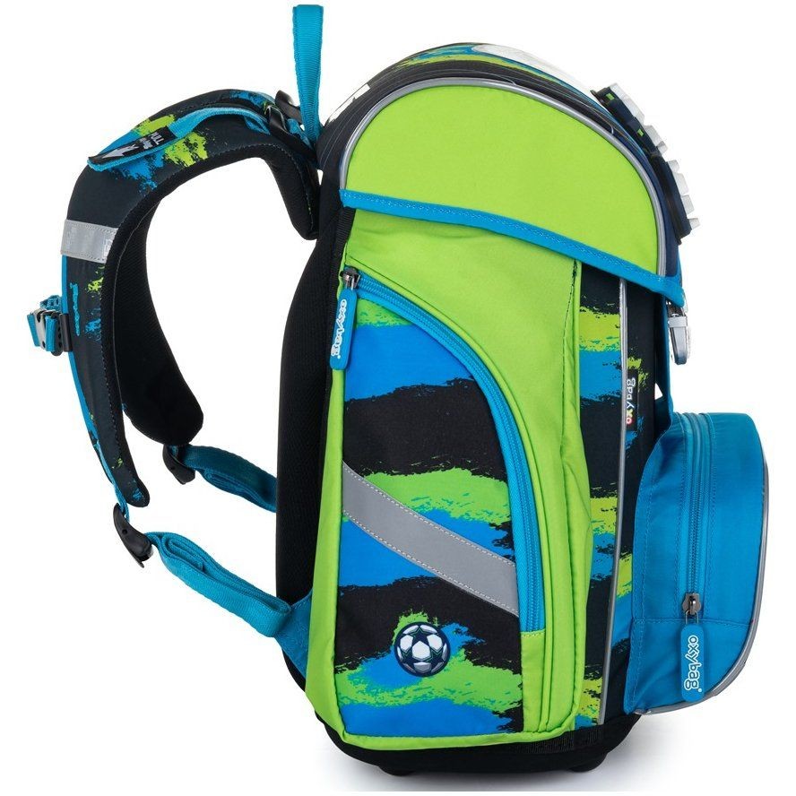 Anatómiai aktatáska az elsősök számára focis motívummal. Három darabos szett iskolatáskából, kihajtható tolltartóból és tornazsákból öszeáll.