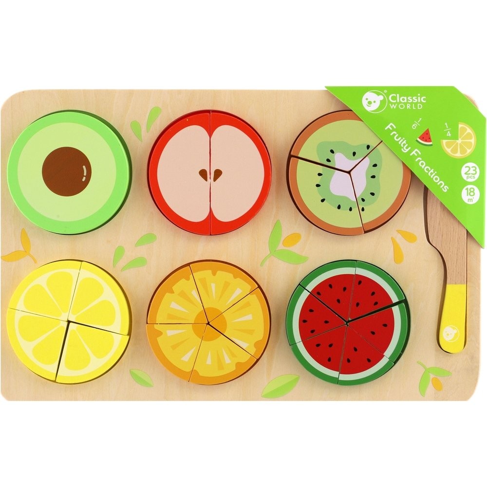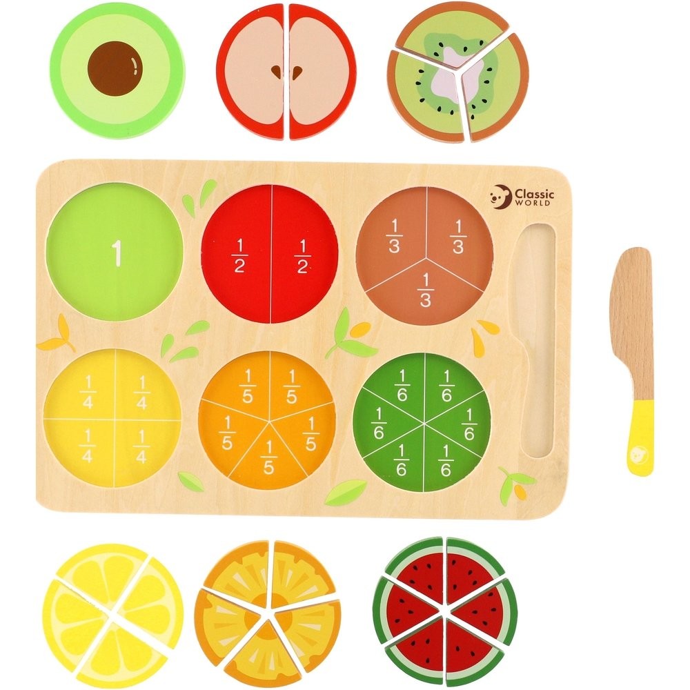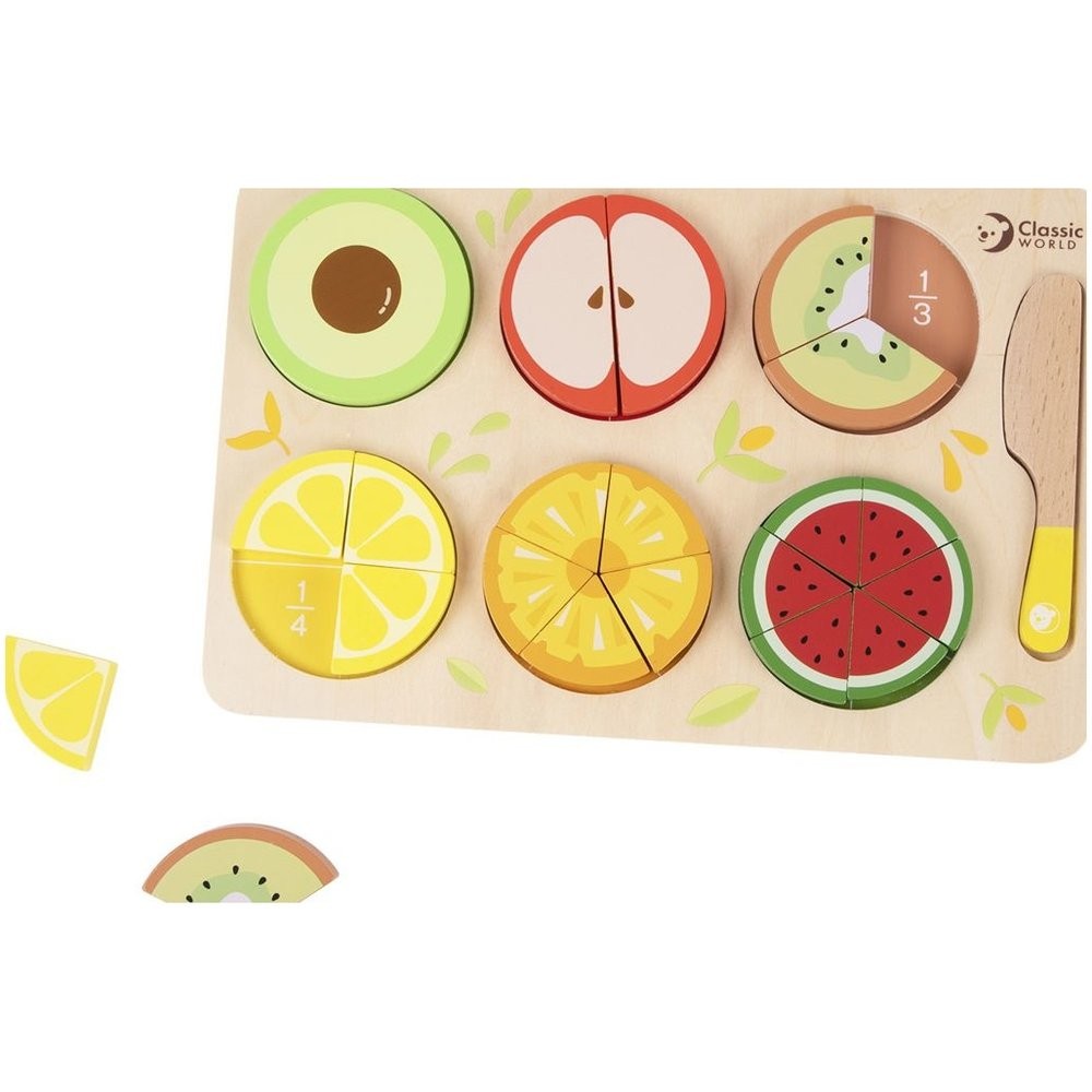 Gyümölcsvágással tanítsd meg a gyerekeknek rossz dolgokat. Fakéssel vágja félbe, negyedbe, harmadba a gyümölcsöt... A töredékek a gyümölcs alá vannak nyomtatva, hogy a gyerekek megértsék őket. A készlet 23 fa alkatrészt tartalmaz. A fatábla mérete: 30 x 20 cm 18 hónapos kortól használható