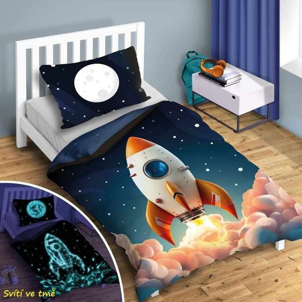 Űr világító ágyneműhuzat fiúknak rakétával. A nagy ágyra való ágynemű cipzárral záródik, 40 °C-on mosható.A gyermekek számára készült ágynemű nappali fényben megvilágítva sötétben világít, a világító hatás 5 mosás után elhalványulhat.