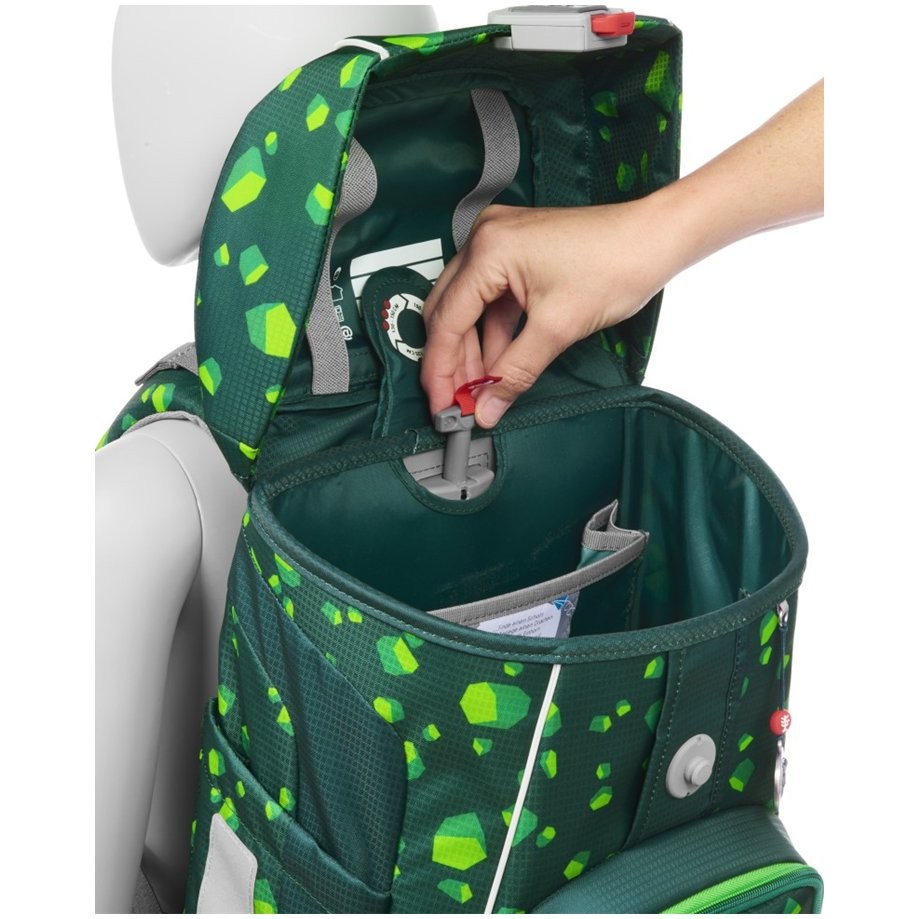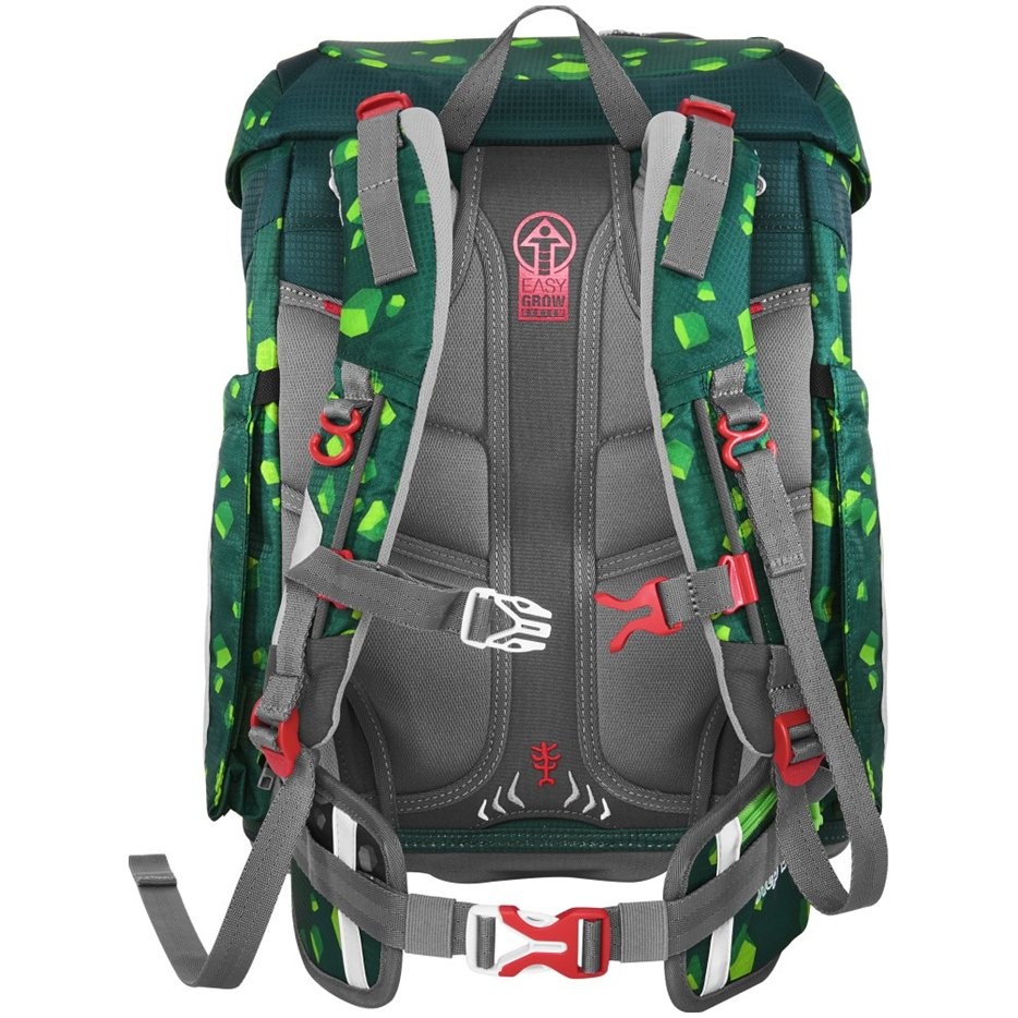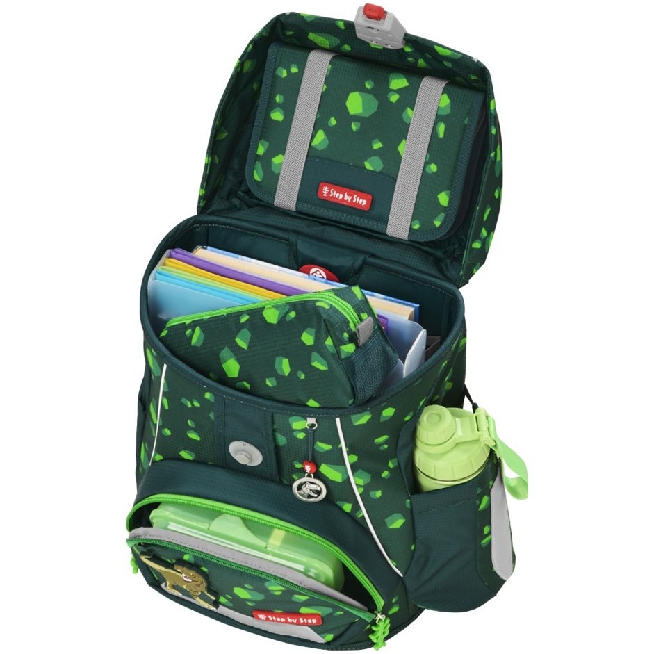 Az iskolatáska mindössze 990 g súlyú, és 100 és 150 cm közötti magasságú gyermekek számára alkalmas. Az iskolatáska cserélhető MAGIC MAGS képekkel és EASY GROW SYSTEM rendszerrel rendelkezik, ami azt jelenti, hogy a táska a gyermekkel együtt növekszik (a táska 1. és 4. osztály közötti gyermekek számára alkalmas). Az ultrakönnyű üvegszálas hátlap, az ergonómiailag formázott hátlap légáteresztő párnázással, valamint az állítható és ergonómikus vállpántok mind magától értetődőek a Step by Step iskolatáskában. Az iskolatáska ezenkívül húzópántokkal is rendelkezik a táska hátuljához való szoros illeszkedés érdekében, levehető, magasságban állítható mellkaspánttal, fogantyúkkal a vállpántok végein és párnázott, levehető csípőövvel, kis oldalsó cipzáras zsebbel. Az elülső zseb hőszigetelő réteggel és vízelvezető lyukakkal ideális a harapnivalók tárolására. A nyitott oldalsó zsebek kifelé nyúlnak vízelvezető lyukakkal és hordozó/akasztó hurokkal. Az iskolatáska FIDLOCK mágneses zárral záródik. A belső zsebbel ellátott fő zseb nehezebb tárgyak (könyvek, jegyzetfüzetek) tárolására alkalmas, a fedélben lévő rugalmas anyagnak köszönhetően több hely van a táskában a tolltartó gazdaságos tárolásának köszönhetően. Vízálló, tömör alj és rejtett AirTag rekesz. Fényvisszaverő elemek a nagyobb biztonságért a közúti forgalomban, sötétben és éjszaka