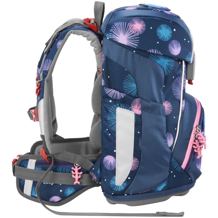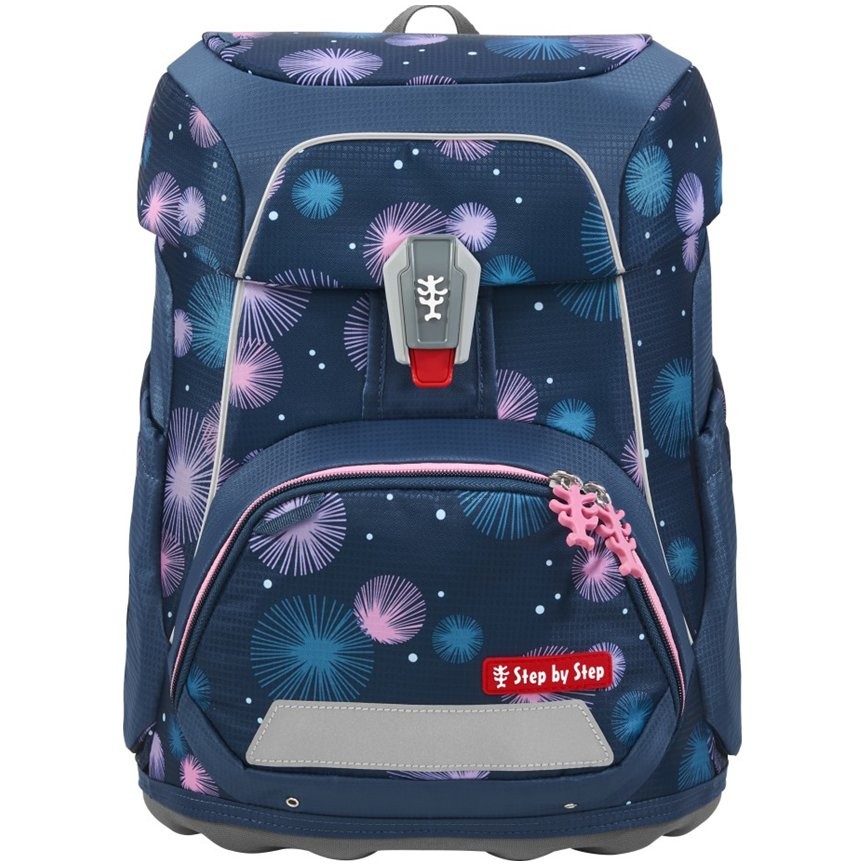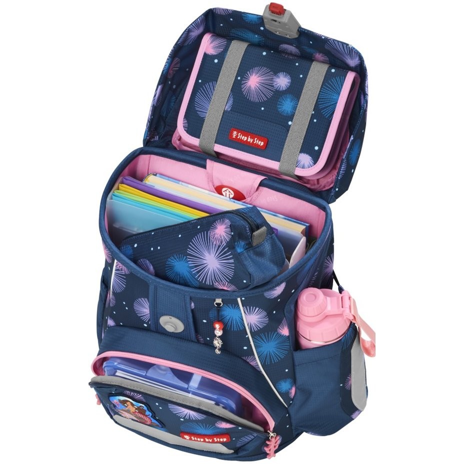 Iskolatáska elsősöknek mindössze 990 g súlyú, és 100 és 150 cm közötti magasságú gyermekek számára alkalmas. Az iskolatáska cserélhető MAGIC MAGS képekkel és EASY GROW SYSTEM rendszerrel rendelkezik, ami azt jelenti, hogy a táska a gyermekkel együtt növekszik (a táska 1. és 4. osztály közötti gyermekek számára alkalmas). Az ultrakönnyű üvegszálas hátlap, ergonómiailag formázott hátlap légáteresztő párnázással, valamint az állítható és ergonómiailag kialakított vállpántok magától értetődőek a Step by Step iskolatáskánál. Az iskolatáska ezenkívül húzópántokkal is rendelkezik a táska hátuljához való szoros illeszkedés érdekében, levehető, magasságban állítható mellkaspánttal, fogantyúkkal a vállpántok végein és párnázott, levehető csípőövvel, kis oldalsó cipzáras zsebbel. Az elülső zseb hőszigetelő réteggel és vízelvezető lyukakkal ideális a harapnivalók tárolására. A nyitott oldalsó zsebek kifelé nyúlnak vízelvezető lyukakkal és hordozó/akasztó hurokkal. Az aktatáska FIDLOCK mágneses zárral záródik. A belső zsebbel ellátott fő zseb nehezebb tárgyak (könyvek, jegyzetfüzetek) tárolására alkalmas, a fedélben lévő rugalmas anyagnak köszönhetően több hely van a táskában a tolltartó gazdaságos tárolásának köszönhetően. Vízálló, tömör alj és rejtett AirTag rekesz. Fényvisszaverő elemek a nagyobb biztonság érdekében a közúti közlekedésben, sötétben és éjszaka.