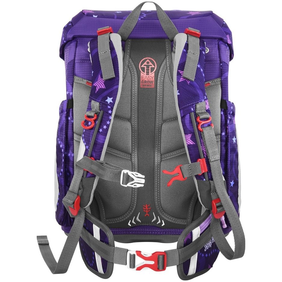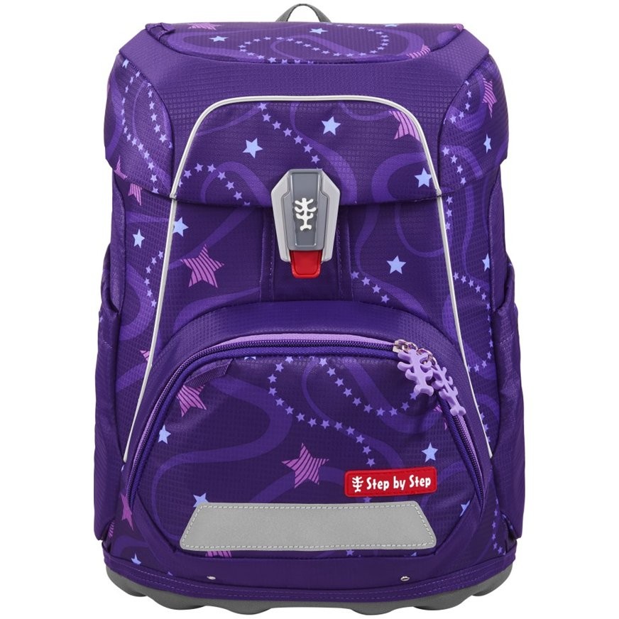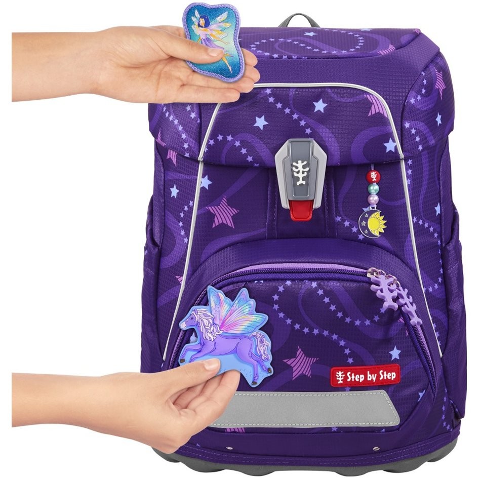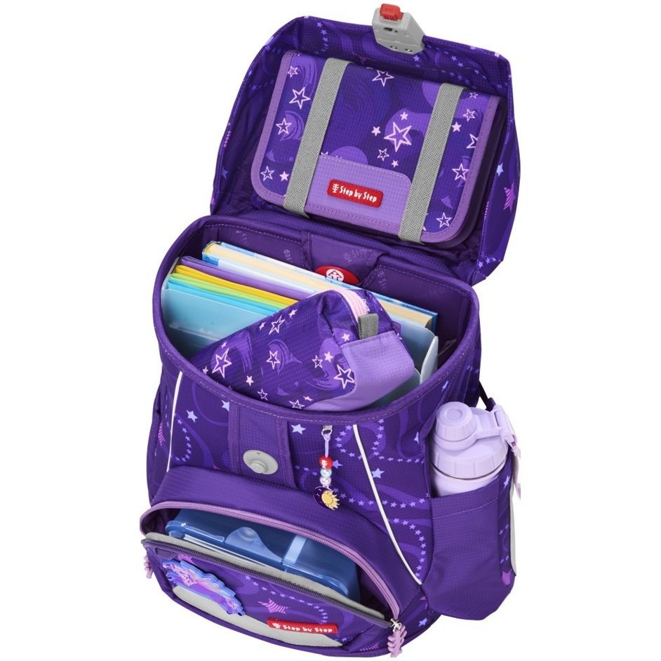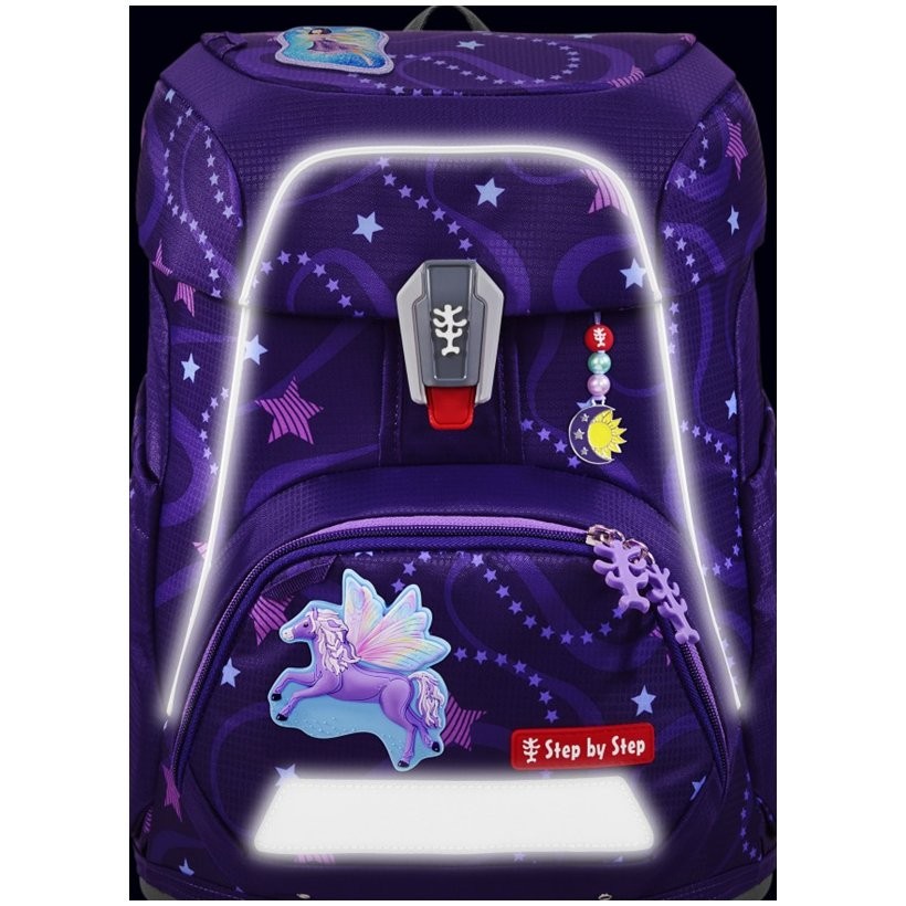 Az elsőéveseknek szánt iskolatáska mindössze 990 g súlyú, és 100 és 150 cm közötti magasságú gyermekek számára alkalmas. Az aktatáska cserélhető MAGIC MAGS képekkel és EASY GROW SYSTEM rendszerrel rendelkezik, ami azt jelenti, hogy a táska a gyermekkel együtt nő (az iskolatáska 1. és 4. osztály közötti gyermekek számára alkalmas). Az ultrakönnyű üvegszálas hátlap, az ergonómikusan formázott hátlap légáteresztő párnázással, valamint az állítható és ergonómikus vállpántok magától értetődőek a Step by Step iskolatáskánál. Az iskolatáska ezenkívül húzópántokkal is rendelkezik a táska hátuljához való szoros illeszkedés érdekében, levehető, magasságban állítható mellkaspánttal, fogantyúkkal a vállpántok végein és párnázott, levehető csípőövvel, kis oldalsó cipzáras zsebbel. Az elülső zseb hőszigetelő réteggel és vízelvezető lyukakkal ideális a harapnivalók tárolására. A nyitott oldalsó zsebek kifelé nyúlnak vízelvezető lyukakkal és hordozó/akasztó hurokkal. Az iskolatáska FIDLOCK mágneses zárral záródik. A belső zsebbel ellátott fő zseb nehezebb tárgyak (könyvek, jegyzetfüzetek) tárolására alkalmas, a fedélben lévő rugalmas anyagnak köszönhetően több hely van a táskában a tolltartó gazdaságos tárolásának köszönhetően. Vízálló, tömör alj és rejtett AirTag rekesz. Fényvisszaverő elemek a nagyobb biztonság érdekében a közúti közlekedésben, sötétben és éjszaka.
