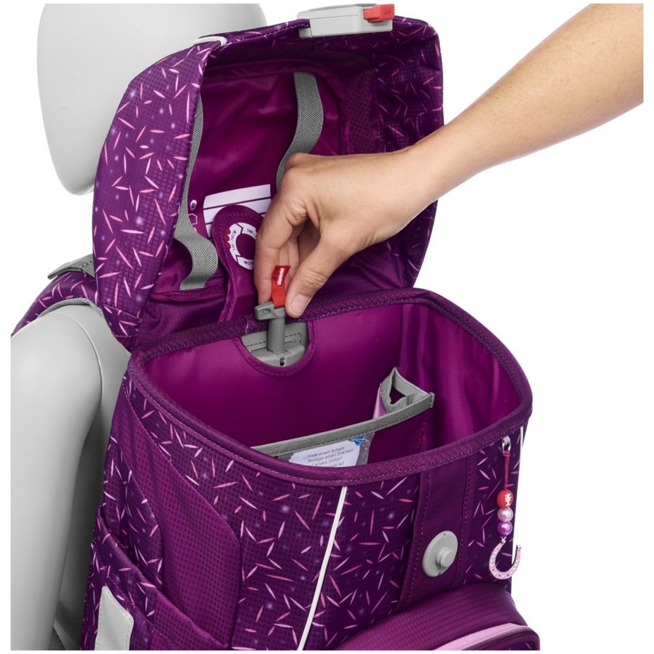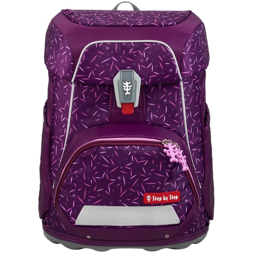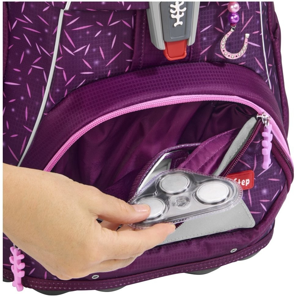 Iskolatáska mindössze 990 g súlyú, és 100 és 150 cm közötti magasságú gyermekek számára alkalmas. Az iskolatáska cserélhető MAGIC MAGS képekkel és EASY GROW SYSTEM rendszerrel rendelkezik, ami azt jelenti, hogy a táska a gyermekkel együtt növekszik (a táska 1. és 4. osztály közötti gyermekek számára alkalmas). Az ultrakönnyű üvegszálas hátlap, az ergonómikusan formázott hátlap légáteresztő párnázással, valamint az állítható és ergonómikus vállpántok magától értetődőek a Step by Step iskolatáskáknál. Az iskolatáska ezenkívül húzópántokkal is rendelkezik a táska hátuljához való szoros illeszkedés érdekében, levehető, magasságban állítható mellkaspánttal, fogantyúkkal a vállpántok végein és párnázott, levehető csípőövvel, kis oldalsó cipzáras zsebbel. Az elülső zseb hőszigetelő réteggel és vízelvezető lyukakkal ideális a harapnivalók tárolására. A nyitott oldalsó zsebek kifelé nyúlnak vízelvezető lyukakkal és hordozó/akasztó hurokkal. Az iskolatáska FIDLOCK mágneses zárral záródik. A belső zsebbel ellátott fő zseb nehezebb tárgyak (könyvek, jegyzetfüzetek) tárolására alkalmas, a fedélben lévő rugalmas anyagnak köszönhetően több hely van a táskában a tolltartó gazdaságos tárolásának köszönhetően. Vízálló, tömör alj és rejtett AirTag rekesz. Fényvisszaverő elemek a nagyobb biztonság érdekében a közúti közlekedésben, sötétben.