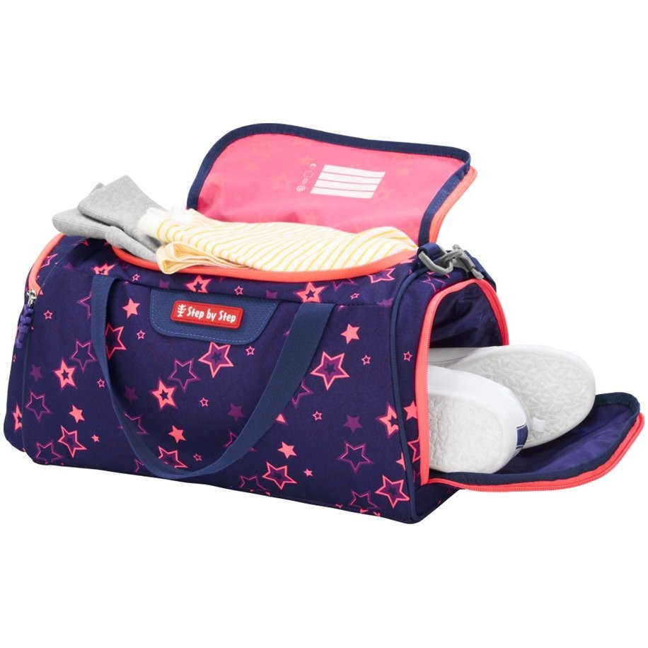 A Step by Step Pegasus Night Nuala sporttáska elegendő helyet kínál minden sportfelszerelés számára. Levehető, hosszában állítható vállpánttal rendelkezik, amely párnázott alátéttel van ellátva a maximális viselési kényelem érdekében. Oldalzseb a mobiltelefon, pénztárca vagy kulcsok biztonságos tárolására, alagútzseb nedves vagy szennyezett ruhák, illetve cipők elhelyezésére, kétirányú cipzár, fedett cipzárak és impregnált anyag a fokozott esőállóságért. A sporttáska továbbá párnázott aljjal és tépőzáras rögzítésű hordfogantyúval is rendelkezik.