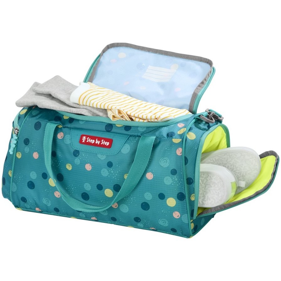 A Step by Step Turtle Josie gyermek sporttáska elegendő helyet kínál minden sportfelszerelés számára a sportcipőtől a pólókig. Levehető, hosszában állítható vállpánttal rendelkezik, amely párnázott alátéttel van ellátva a maximális viselési kényelem érdekében. Oldalzseb a mobiltelefon, pénztárca vagy kulcsok biztonságos tárolására, alagútzseb nedves vagy szennyezett ruhák, illetve cipők elhelyezésére, kétirányú cipzár, fedett cipzárak és impregnált anyag a fokozott esőállóságért. A sporttáska továbbá párnázott aljjal és tépőzáras rögzítésű hordfogantyúval is rendelkezik.