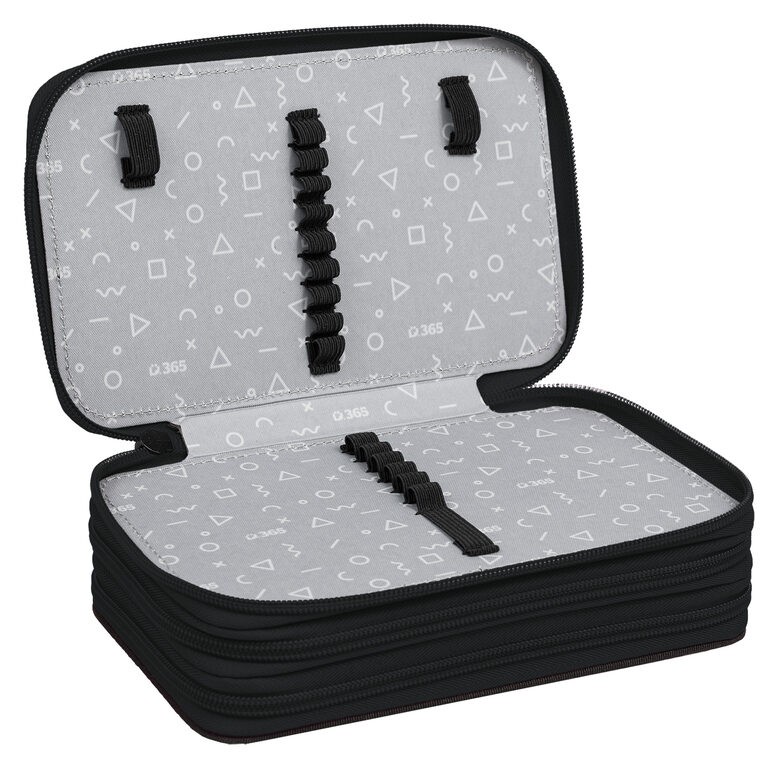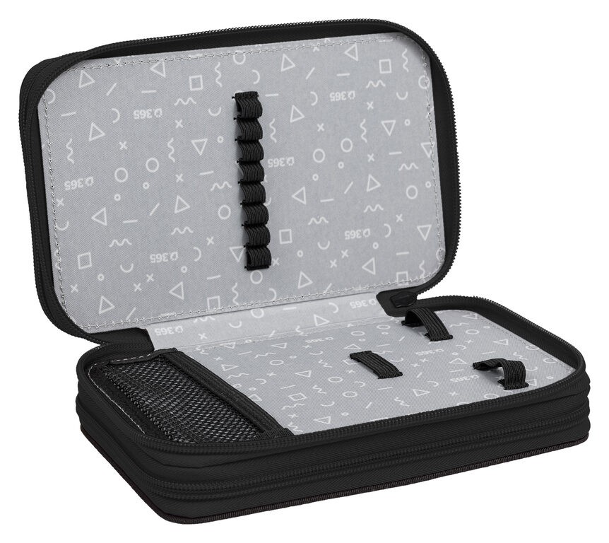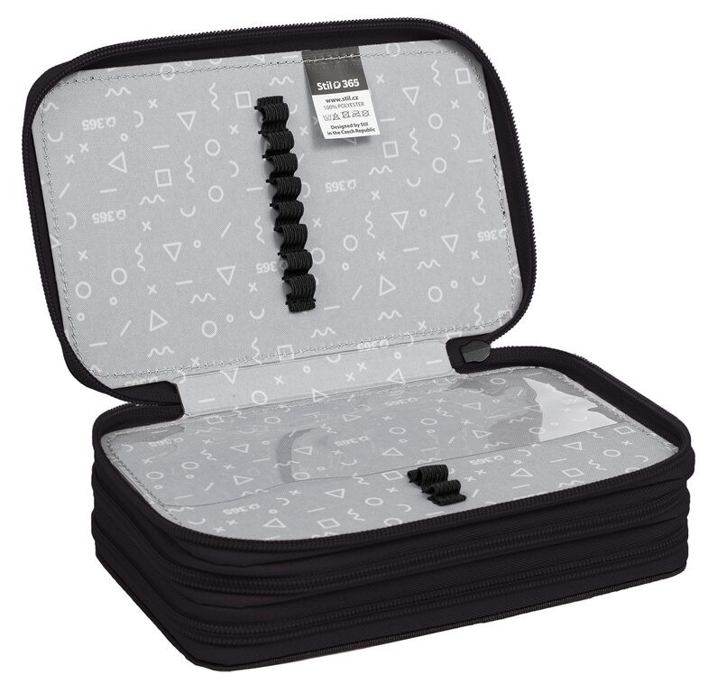 Első szint 8 gumihelyet tartalmaz ceruzákhoz, 3 széles gumit a hegyezőnek és radírnak, valamint egy új hálós zsebet rugalmas szegéllyel apróságok tárolására.