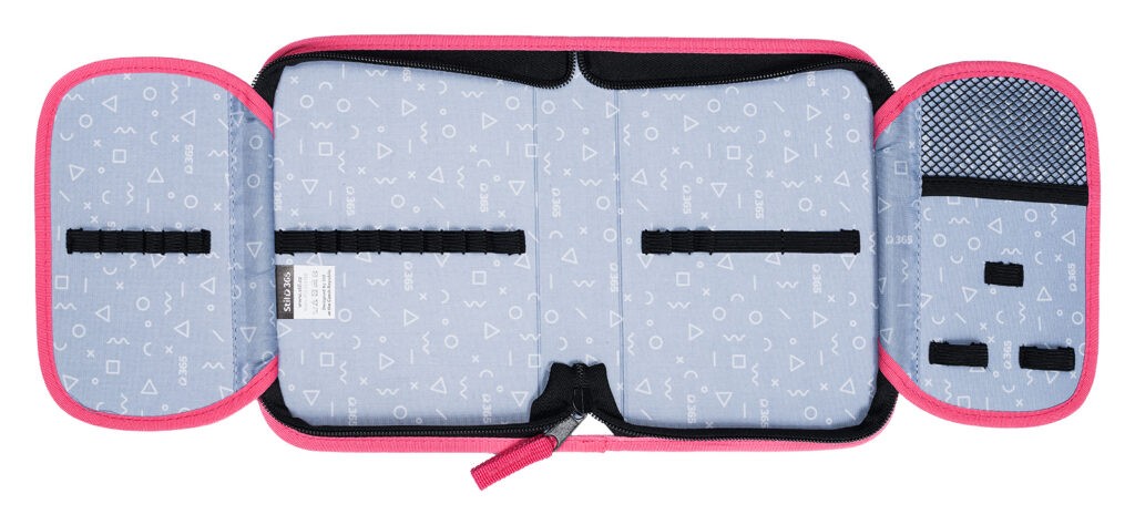 A Stil Cloud egyszintes lányoknak való iskolai tolltartó nagy kapacitással rendelkezik íróeszközök tárolására. Pontosan 24 különböző méretű tömör gumiszalag szolgál zsírkréták, írótoll, ceruzák, vonalzó, hegyező és radír kényelmes tárolására. Újonnan megnöveltük a tolltartó gerincének magasságát, így még több írószer és egyéb kellék fér el benne. A fedelek kívül átlátszó zsebbel rendelkeznek egy határidőnaplónak vagy más kisebb dokumentumoknak, belül pedig egy új hálós zseb található apró tárgyak tárolására. Egy iskolatáskával vagy hátizsákkal színben összehangolt dizájn adott.