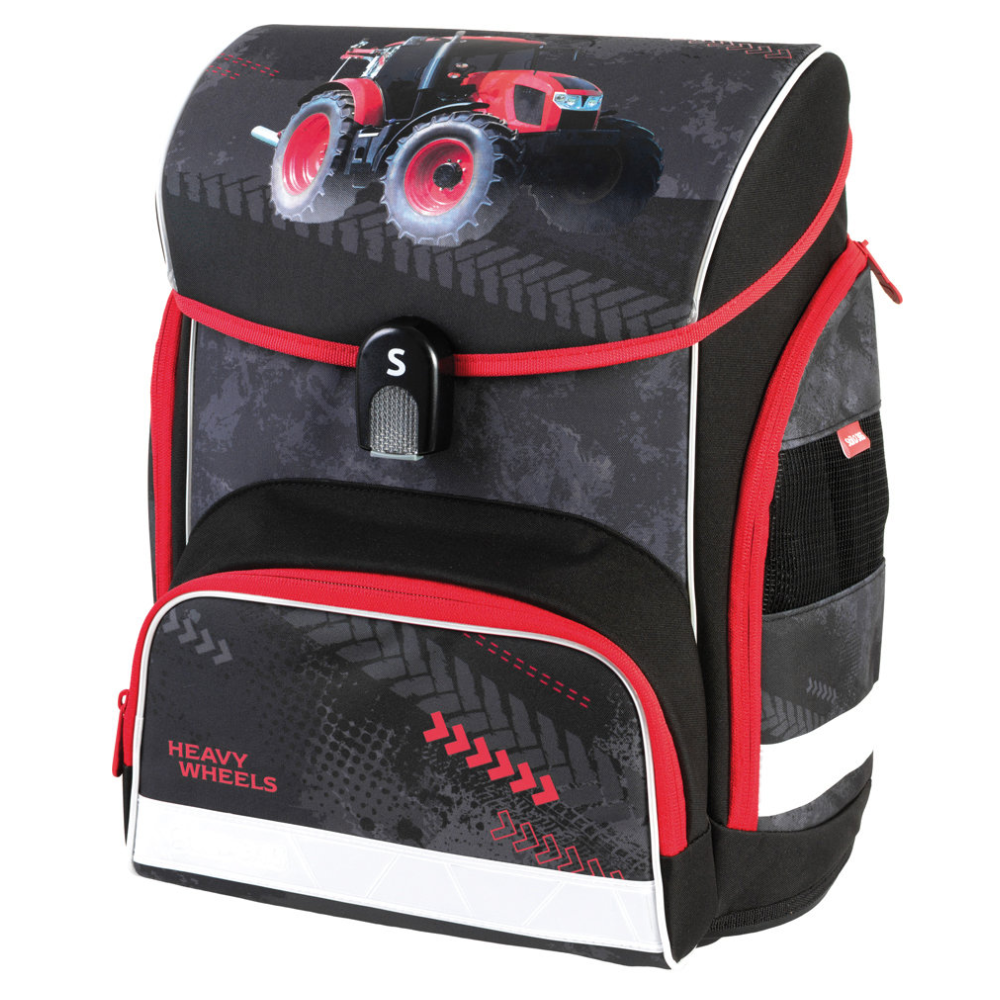 Az iskolatáska belső részét textil válaszfal választja el. A cipzáras oldalzsebek ideálisak egy kulacsnak, az elülső termozseb pedig egy uzsonnás doboznak. Táska minden oldalán található számos fényvisszaverő elem növeli a gyermekek biztonságát a forgalomban.