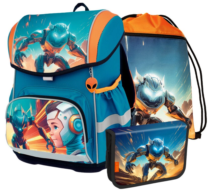 1. Iskolatáska – egy kiváló minőségű, ergonomikus kialakítású, könnyű iskolatáska, fényvisszaverő elemekkel és anatómiailag formázott hátrésszel, masszív szerkezettel.