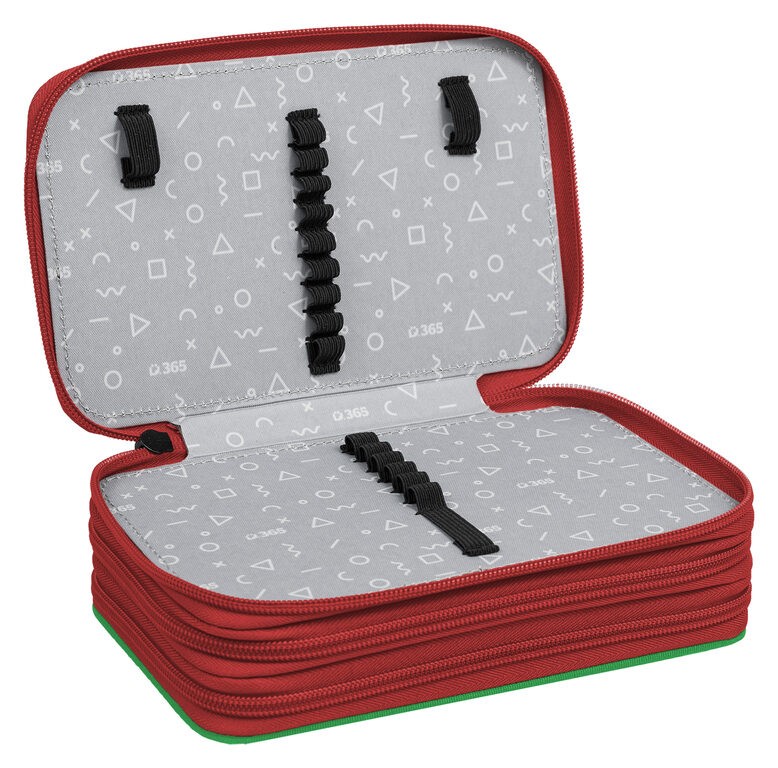 Első szint 8 gumihelyet tartalmaz ceruzákhoz, 3 széles gumit a hegyezőnek és radírnak, valamint egy új hálós zsebet rugalmas szegéllyel apróságok tárolására.