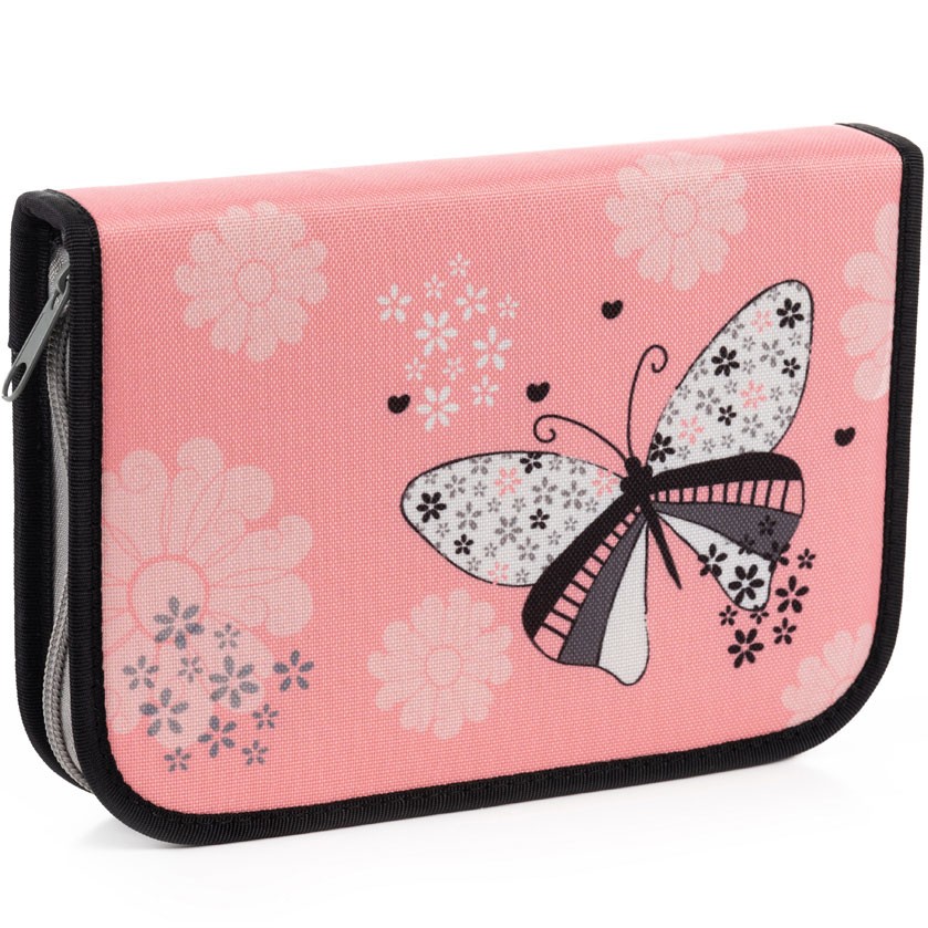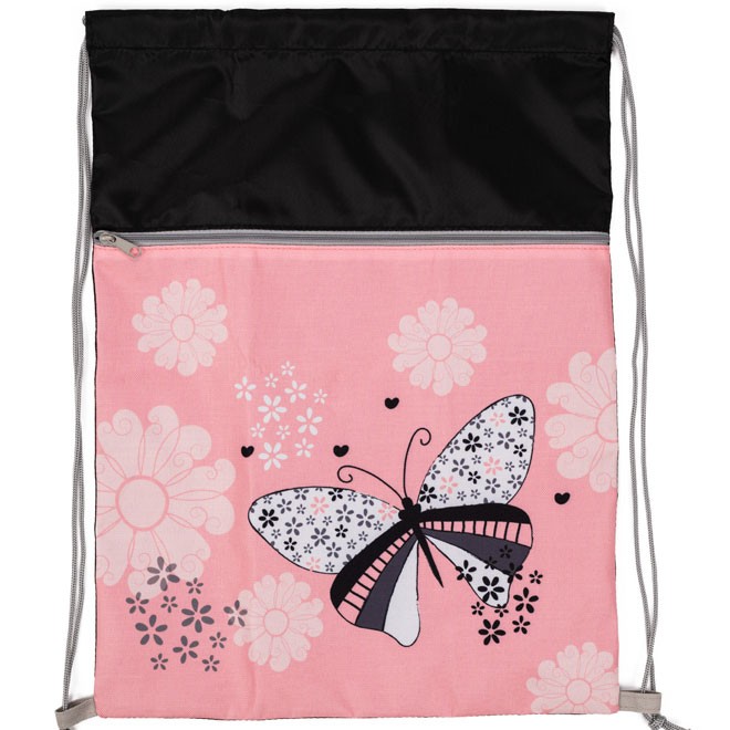 Egyrekeszes iskolatáska általános iskola 1.-3. osztálya számára. A fedelet kedvelt pillangó motívuma díszíti. Három darabos szett iskolatáskából, kihajtható tolltartóból és tornazsákból öszeáll.