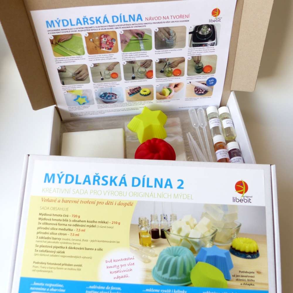 Illatos és színes alkotás gyerekeknek és felnőtteknek két kontrasztos anyaggal, amely teret kínál a változatosabb alkotásnak. A szappankészítés ideális ajándék gyerekeknek. Készlet a haladóbb alkotáshoz szappanok szilikonformákba öntésével, többszínű réteges szappanok vagy szappanmozaikok készítésével.