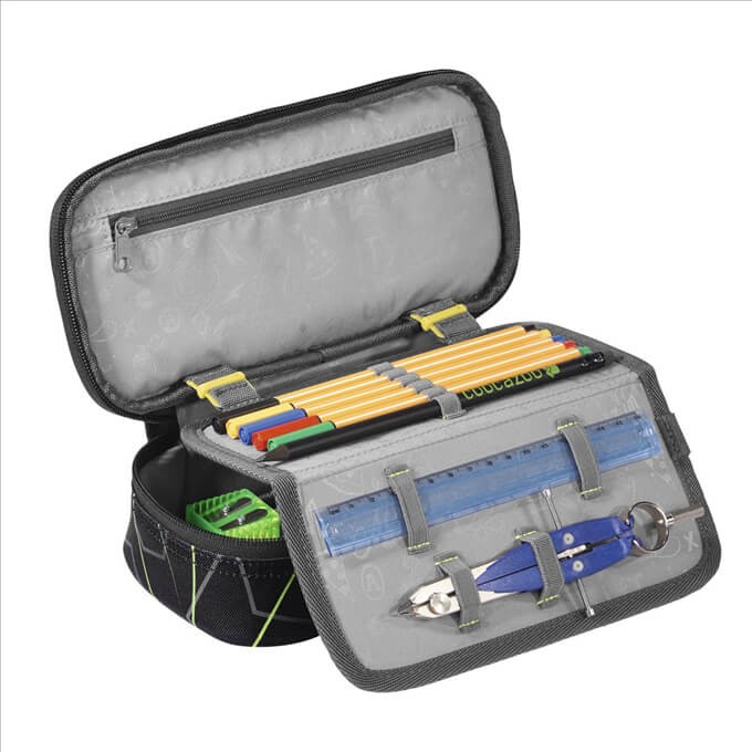 Minőségi diák tolltartó, ceruza, vonalzó, szögmérő, gumi és egyéb iskolai kellékek tárolásához.