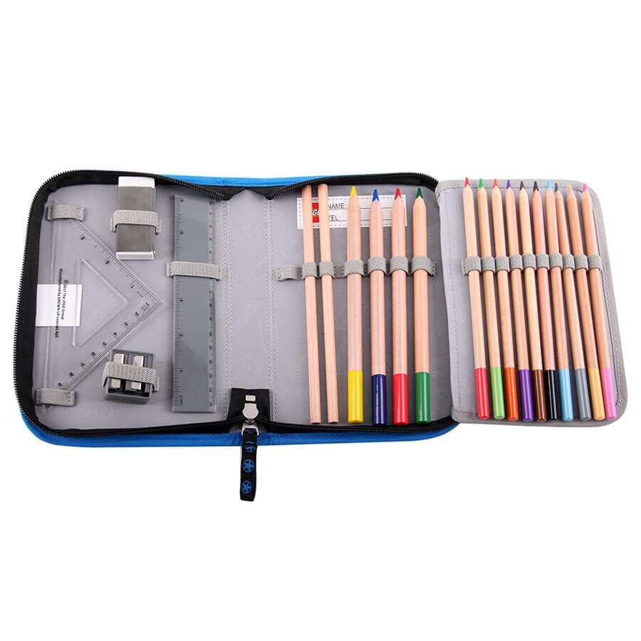 2 háromszög alakú ceruzát, 10 háromszög alakú vékony ceruzát, 4 vastagabb ceruzát, hegyezőt, radírt, 15 cm-es vonalzót és kis háromszöget. Továbbá a név, telefon címket és a menetrendet.