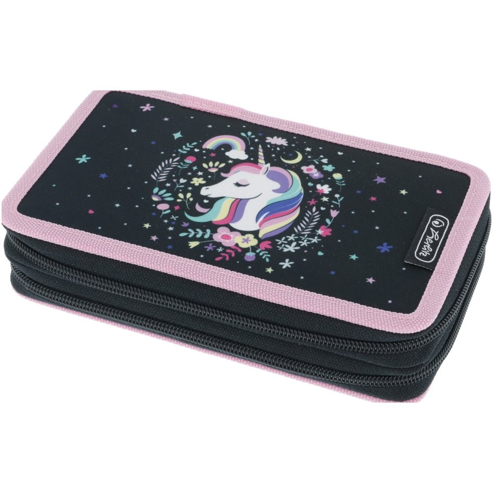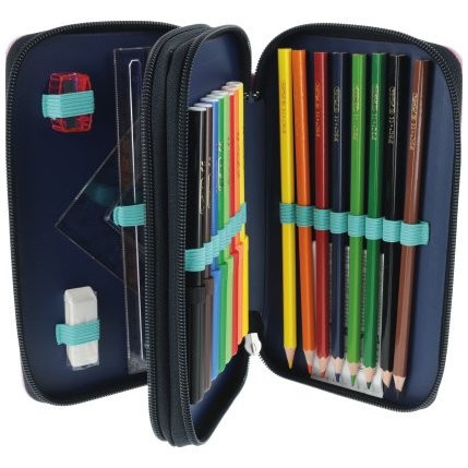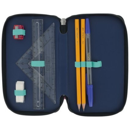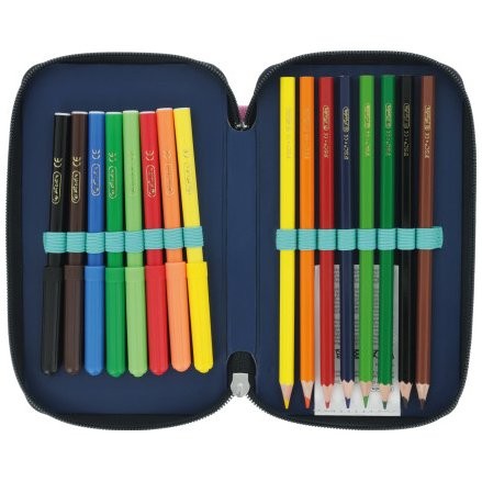 19 x 11 x 4,5 cm, 23 rész - 8 marker, 8 zsírkréta, 2 ceruza, hegyező, radír, golyóstoll, 16 cm-es vonalzó, háromszög, anyaga: poliészter