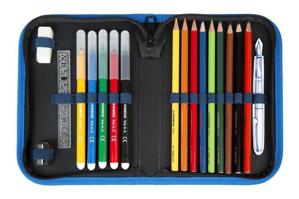 Iskolai tolltartó kedvenc motívummal, kiváló minőségű Stabilo márkázással feltöltött. Tartalmaz: 8 háromszög alakú színes ceruzát, 1 ceruzát, 5 filctollat, betűsablont, élezőt, radírot. Méretek: 19,5 x 13,5 x 3,5 cm
