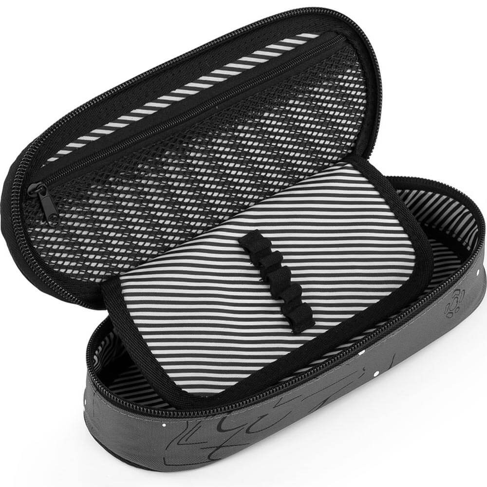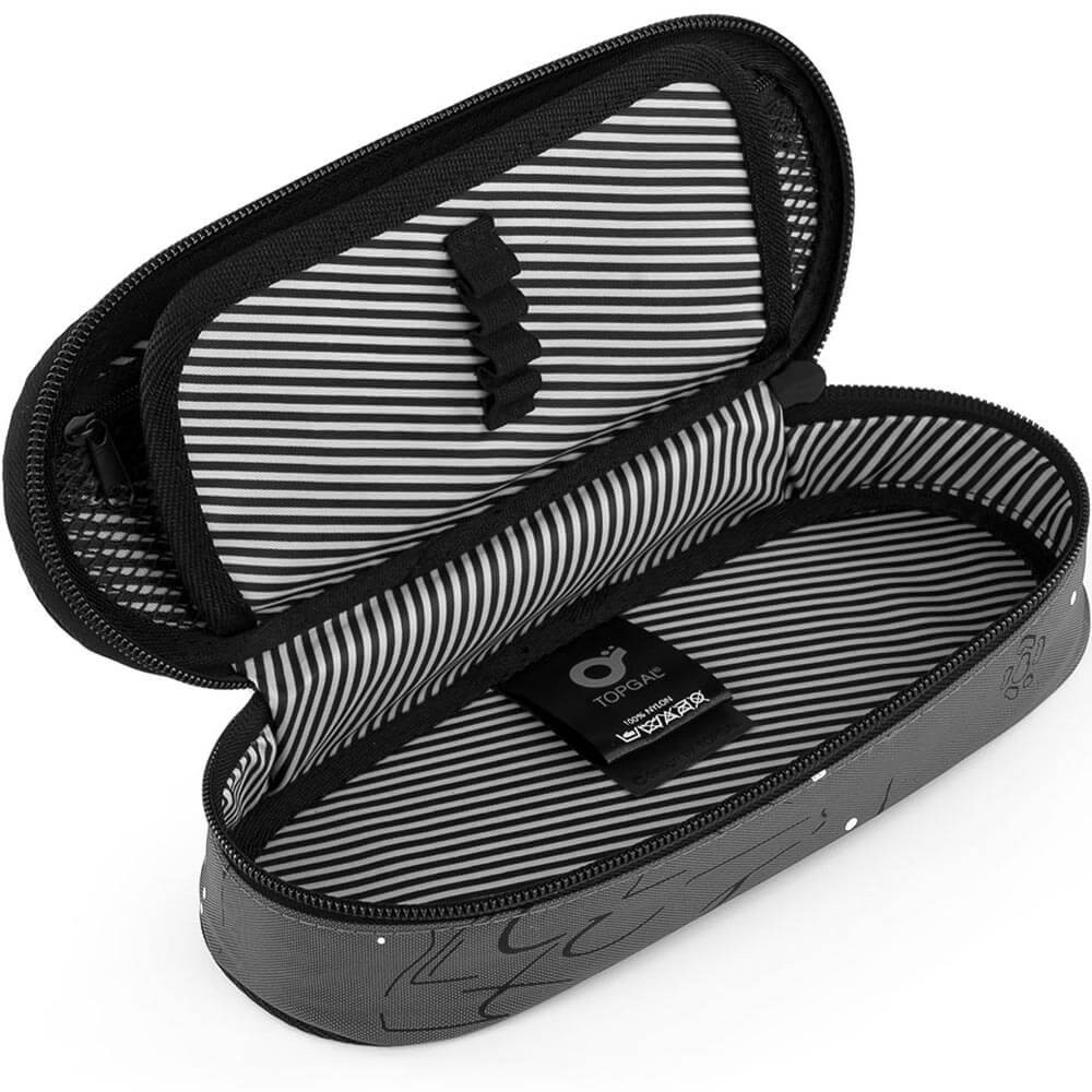 A tolltartón belül egy hálós, cipzáras zseb és egy kilenc gumis füllel ellátott fedél található. A párnázásnak köszönhetően a ceruzák biztosan nem törnek el! A tolltartó nagy cipzárakkal van ellátva, ezért a manipuláció problémamentes.