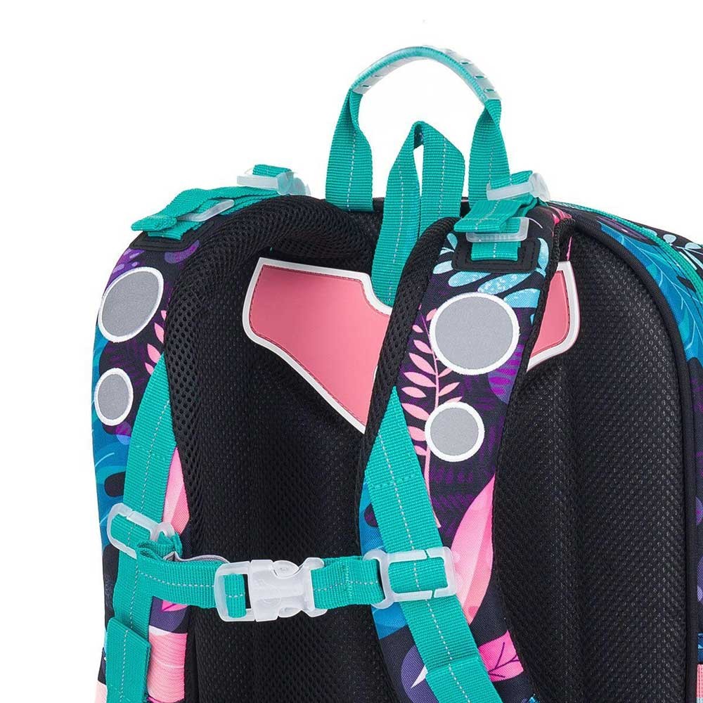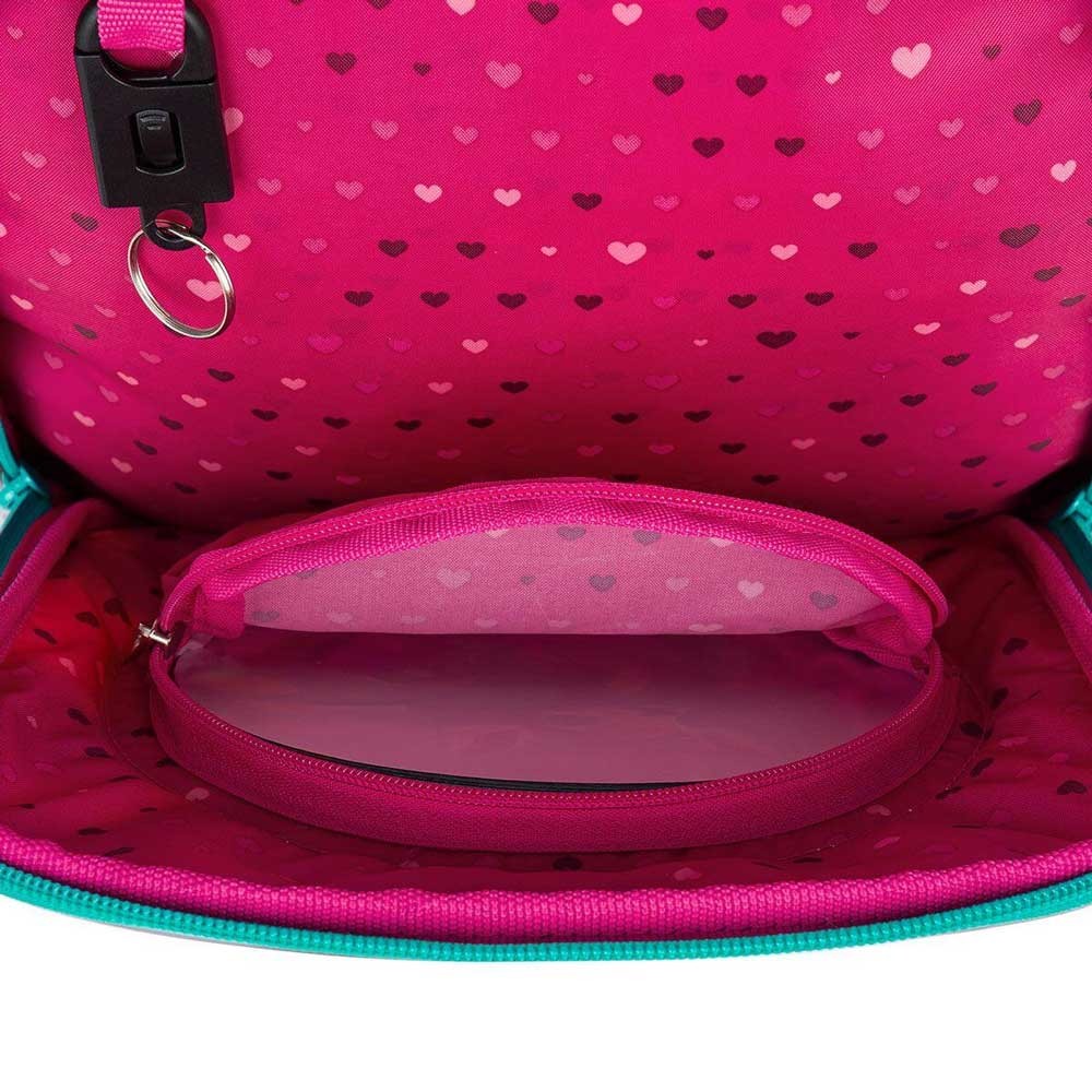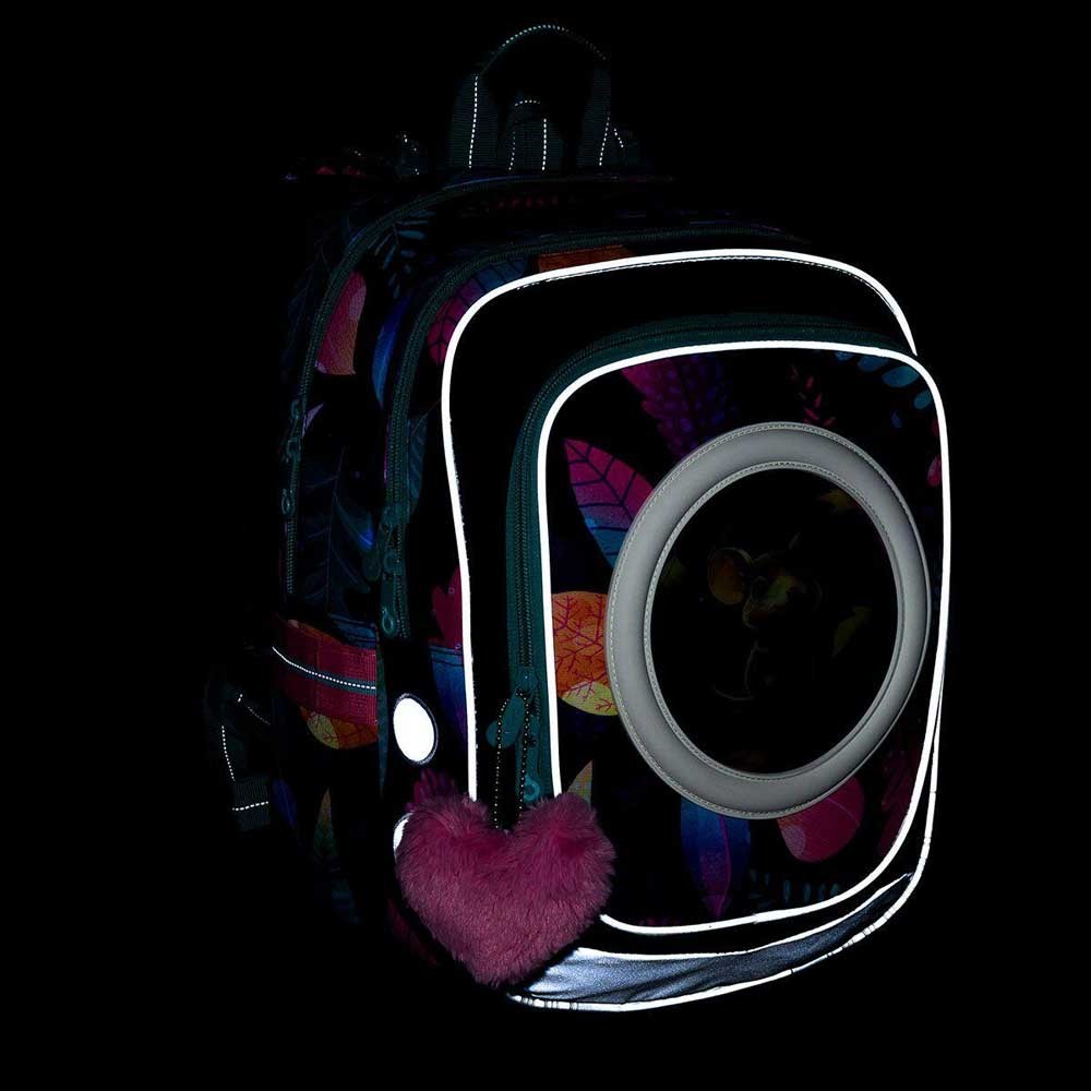 Ultrakönnyű, kétrekeszes hátizsák cserélhető erdei állatos képekkel, 110 cm-es magasságtól lányoknak. A hátizsák négy képet tartalmaz: egy egeret, egy szarvast, egy medvét és egy mókust. A játékos dizájnt egy szív alakú plüss medál egészíti ki.