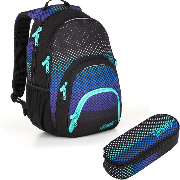 A kétrekeszes diák hátizsákok közkedvelt szabása meg fog felelni a felső tagozatos és a középiskolás diákok számára. A SMALL szett tartalmaz egy ugyanolyan mintájú tolltartót is.