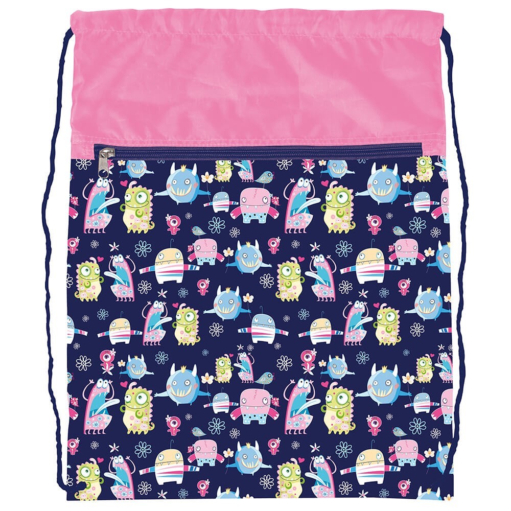 Iskolai tornazsák általános iskolások számára, szörnyecskés motívummal. Erős, jó minőségű anyagból készült, húzózsinórral záródik, amely vállpántként is szolgál. Az elején egy nagy cipzáras zseb található. Mérete: 44 x 32 cm. Gyártó: Stil