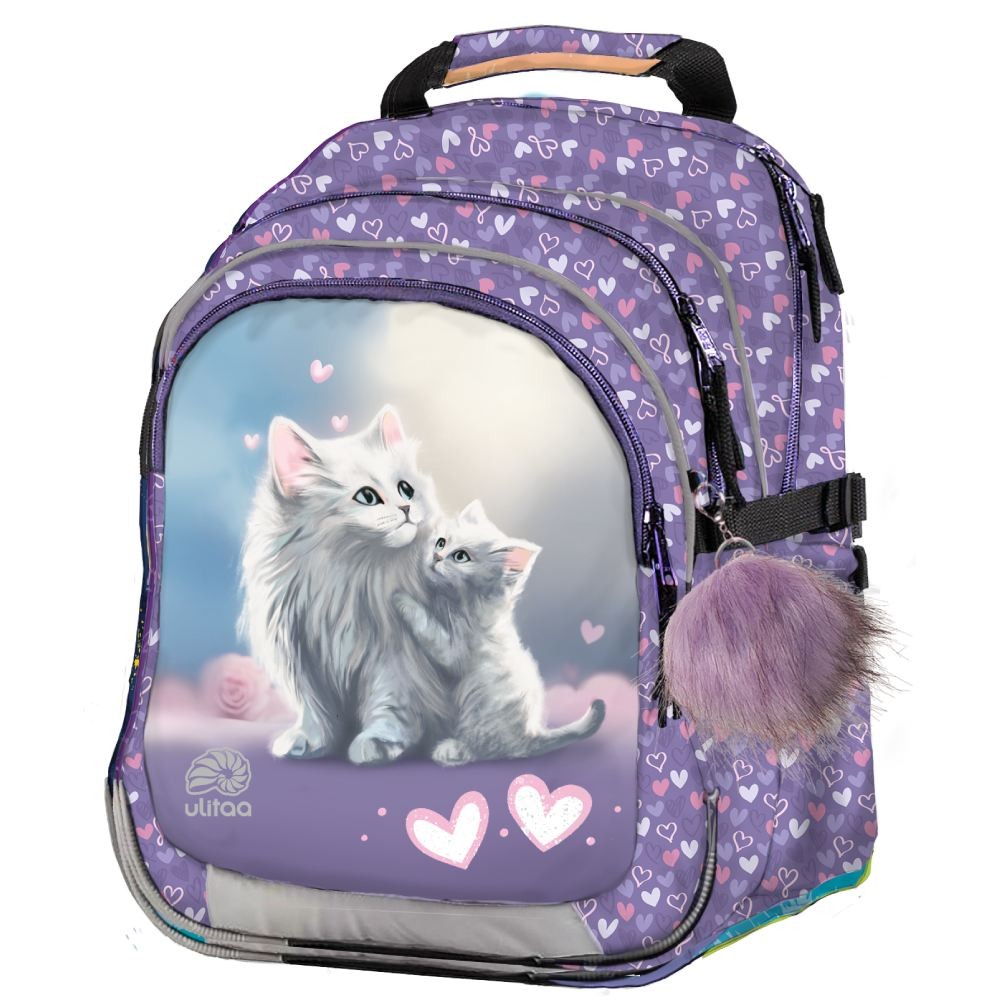 Az Ulitaa Klassik elsősöknek való iskolatáska aranyos kiscicákkal kifejezetten közepes termetű elsősök számára készült. Az Ulitaa Ergonómikus Klasik hátizsákja kb. 123 és 140 cm közötti magasságú gyermekek számára alkalmas, akiknek már nincs szükségük kisebb hátizsákra, de megfelelő háttámaszra van szükségük. A Klasik modell kényelmes hordozást, megfelelő súlyelosztást és tökéletes illeszkedést kínál közepes és nagyobb termetű iskolás gyerekek számára. Ideális kiegészítőjeként alkottuk meg kisebb Ulitaa Mini hátizsákjainknak, bővítve a kínálatot, hogy minden első osztályos megtalálhassa a számára igazán megfelelő hátizsákot.