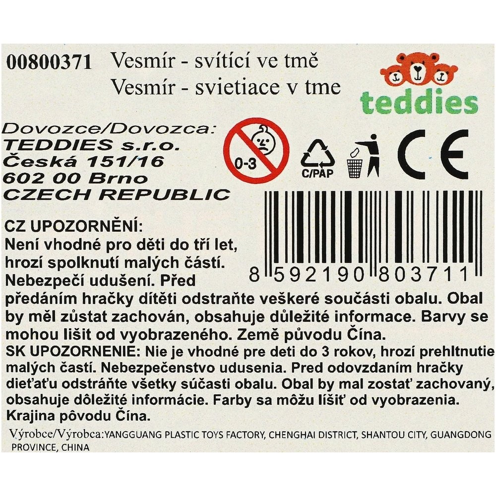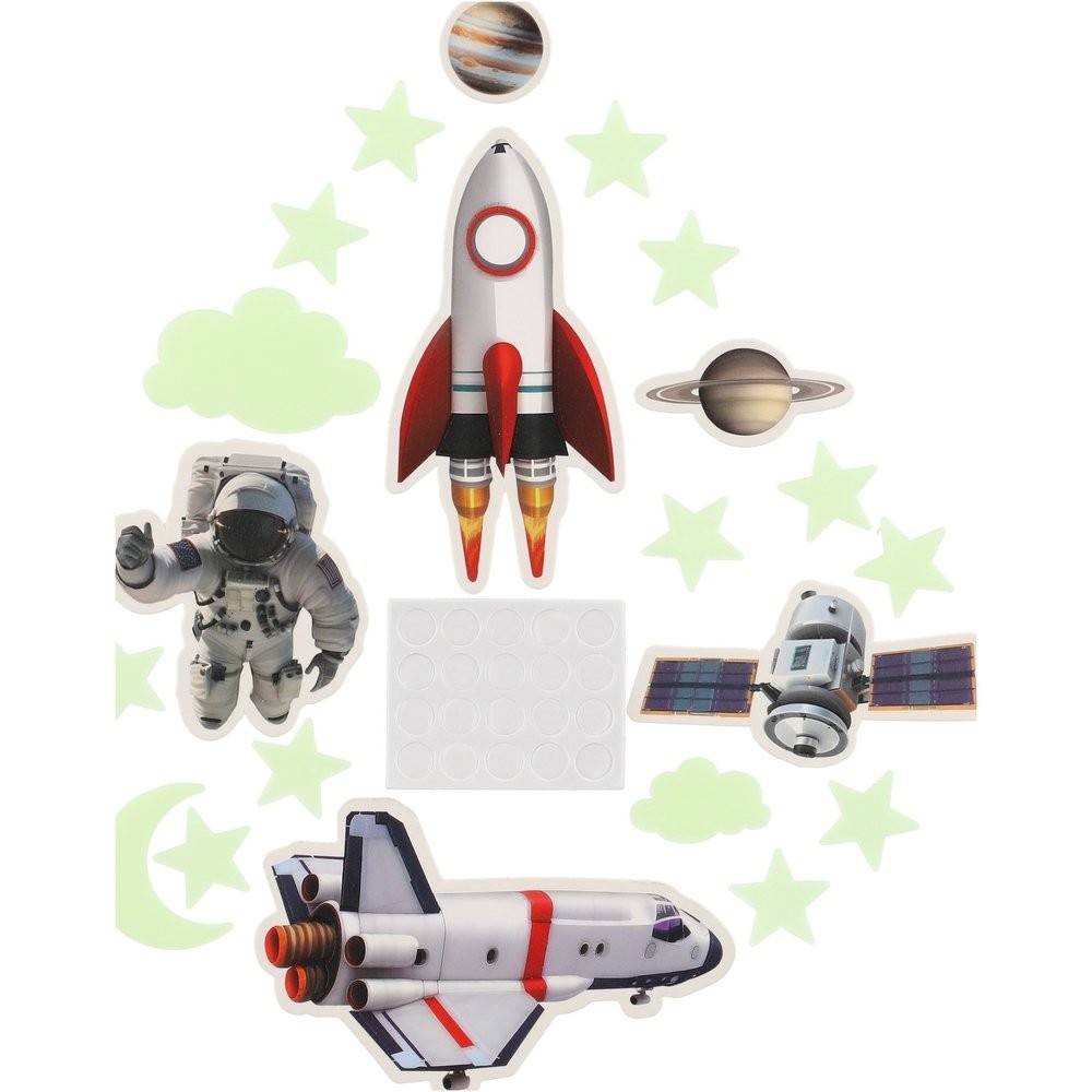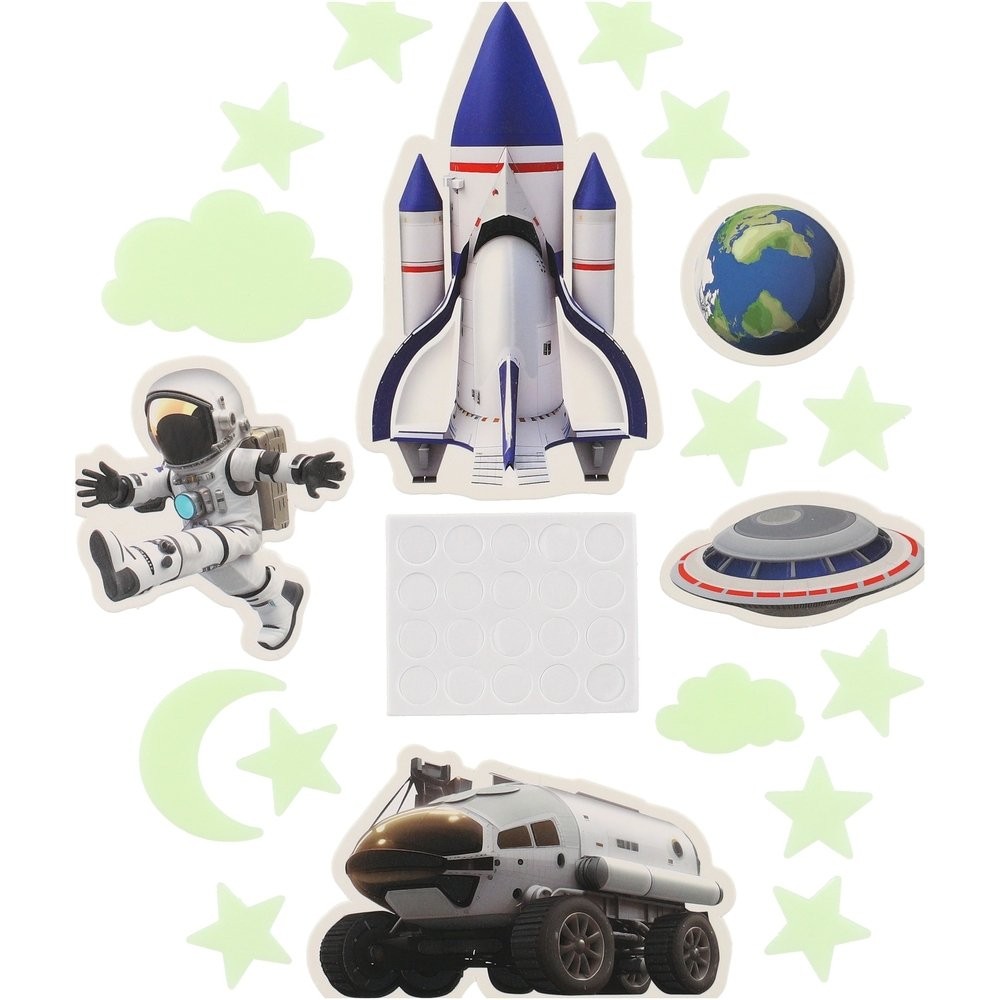 A készlet gyönyörű űrmotívumokat tartalmaz, amelyek a sötétben megvilágítva megvilágosodnak és varázslatos atmoszférát varázsolnak, tele csillagokkal és bolygókkal. Ezek a dekorációk tökéletesek a kis űrkutatók számára, akik szeretnék hazahozni a galaxis egy darabját. Az izzó térmotívumok nem csak az esti órákat teszik kellemesebbé, de a gyerekek elalvását is segítik a varázslatos, csillagokkal teli környezetben. A csomag mérete 17 x 25 x 2 cm. Gyermekeknek 3 éves kortól alkalmas.
