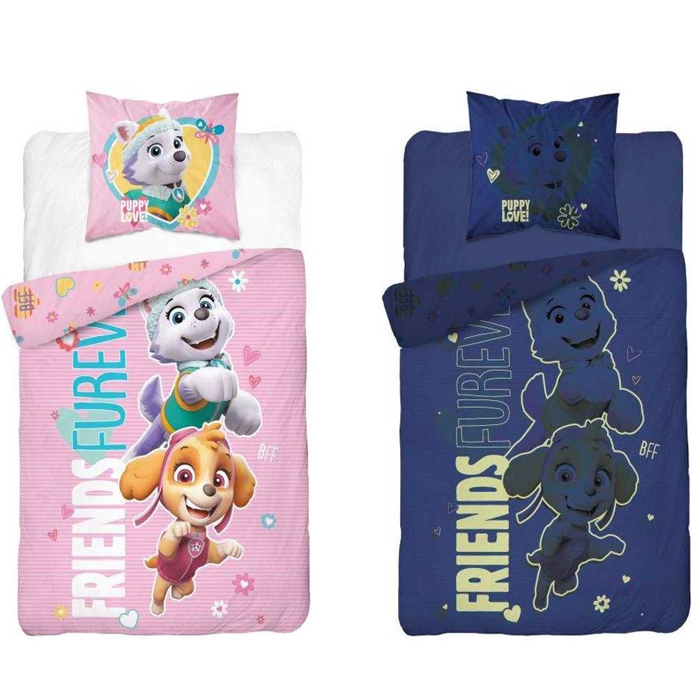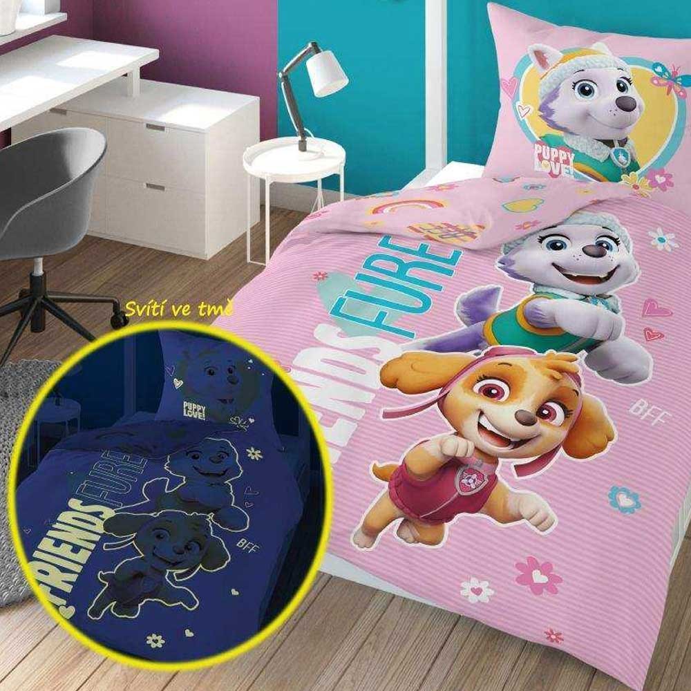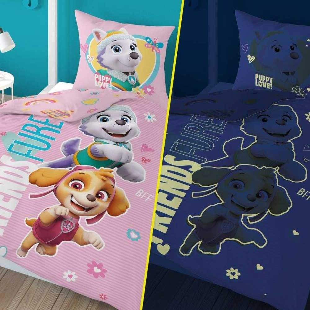 Gyermekágynemű lányok mancs őrjáratának kölyökkutyáinak. A rózsaszín ágynemű sötétben világít a napfényben történő megvilágítás után, az izzó hatás 5 mosás után elhalványulhat. Ágynemű egy nagy ágyhoz, tartalmaz egy fedelet 140/200 cm-re egy takaróhoz és egy 70x80 cm-es fedelet egy párnához, a rögzítés cipzár.
