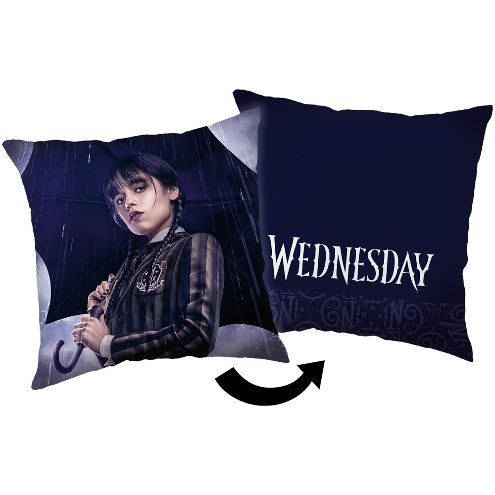 Bársony párnahuzat Wednesday motívummal. Mindegyik oldalon más-más kép látható.